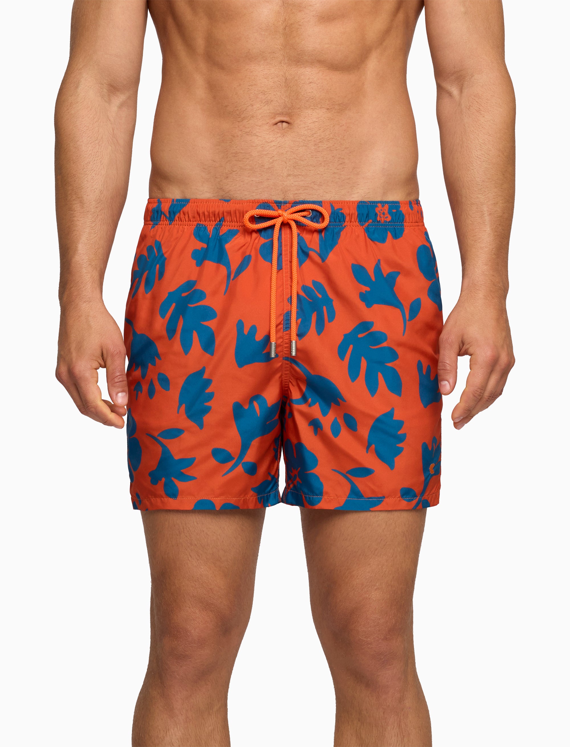 Boxer mare da uomo caratterizzati da una raffinata fantasia floreale in una calda tonalità arancio. La stampa, ispirata alla natura, evoca un senso di libertà e freschezza, perfetta per le giornate estive. La silhouette si adatta perfettamente al corpo, garantendo un comfort senza pari.