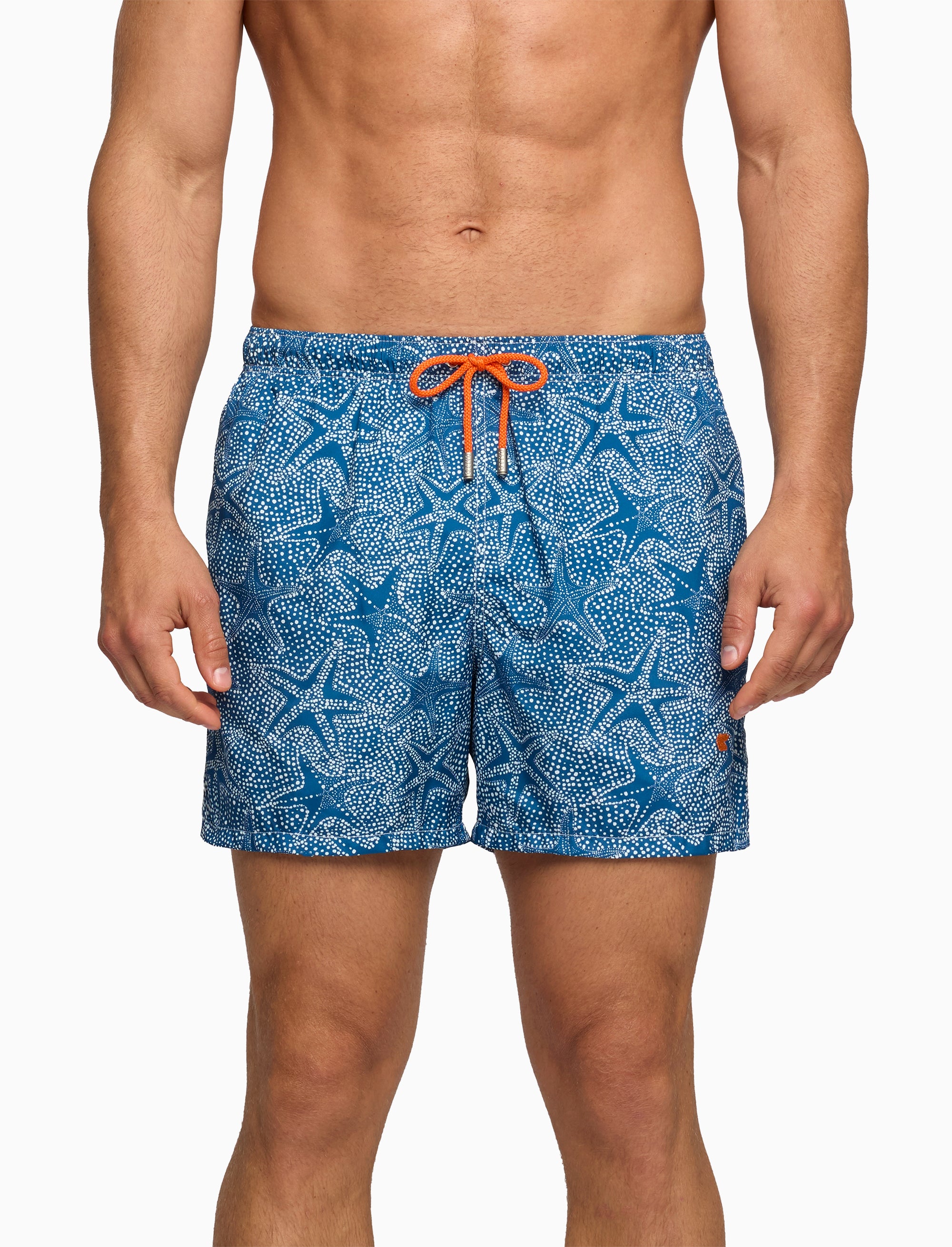 Boxer mare da uomo caratterizzati da una raffinata fantasia di stelle marine su una base blu profonda, evocano il richiamo del mare e la bellezza della natura. Il design, elegante e distintivo, si ispira alle tradizioni artigianali, riflettendo un'estetica senza tempo.