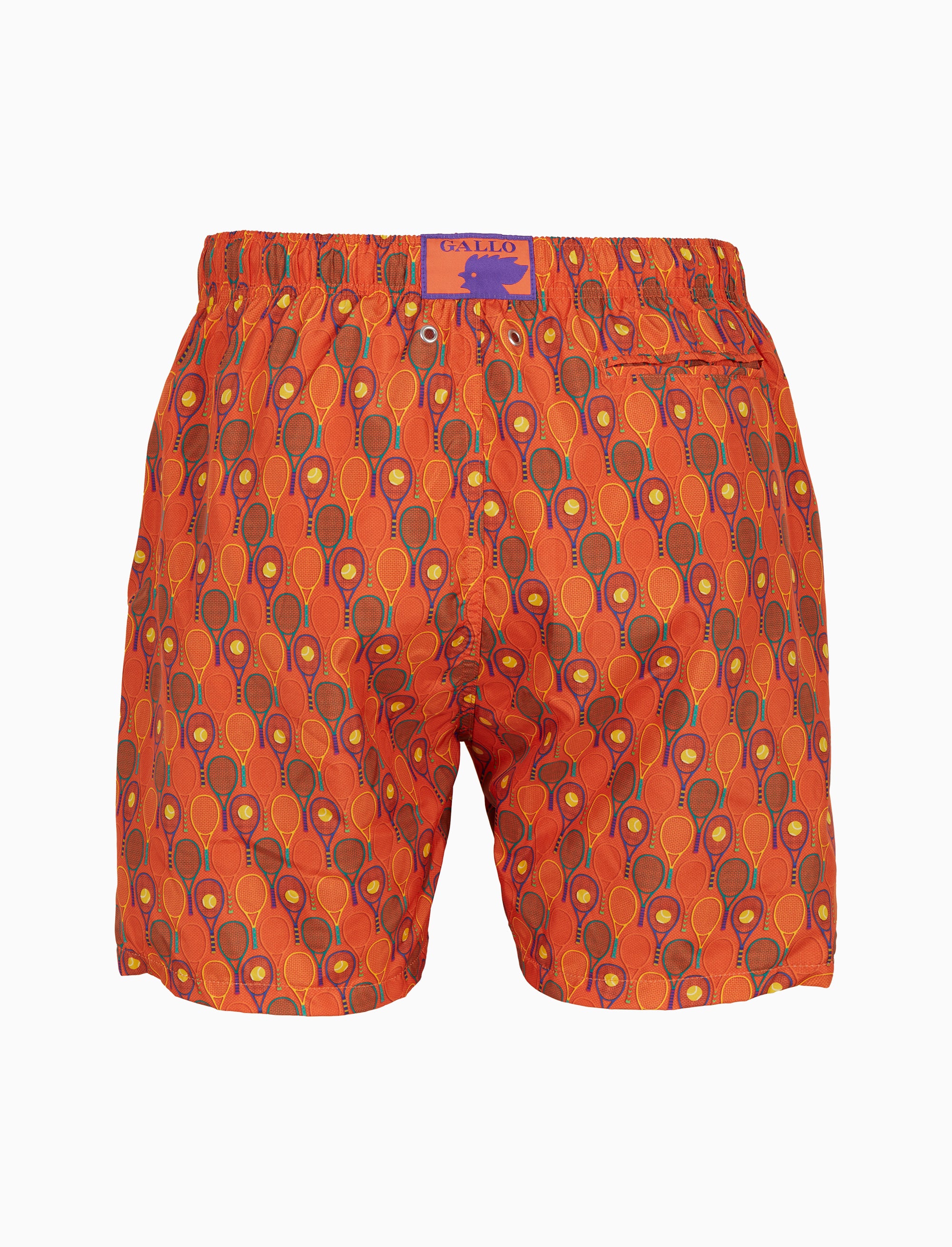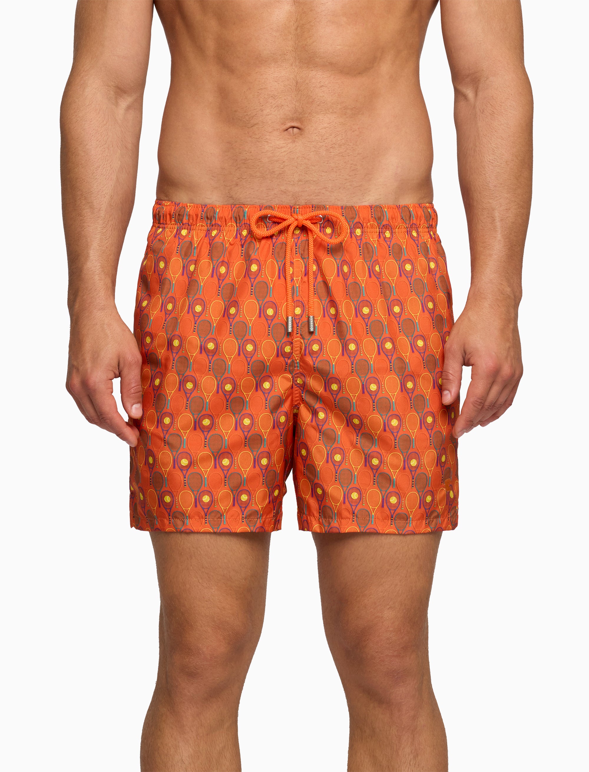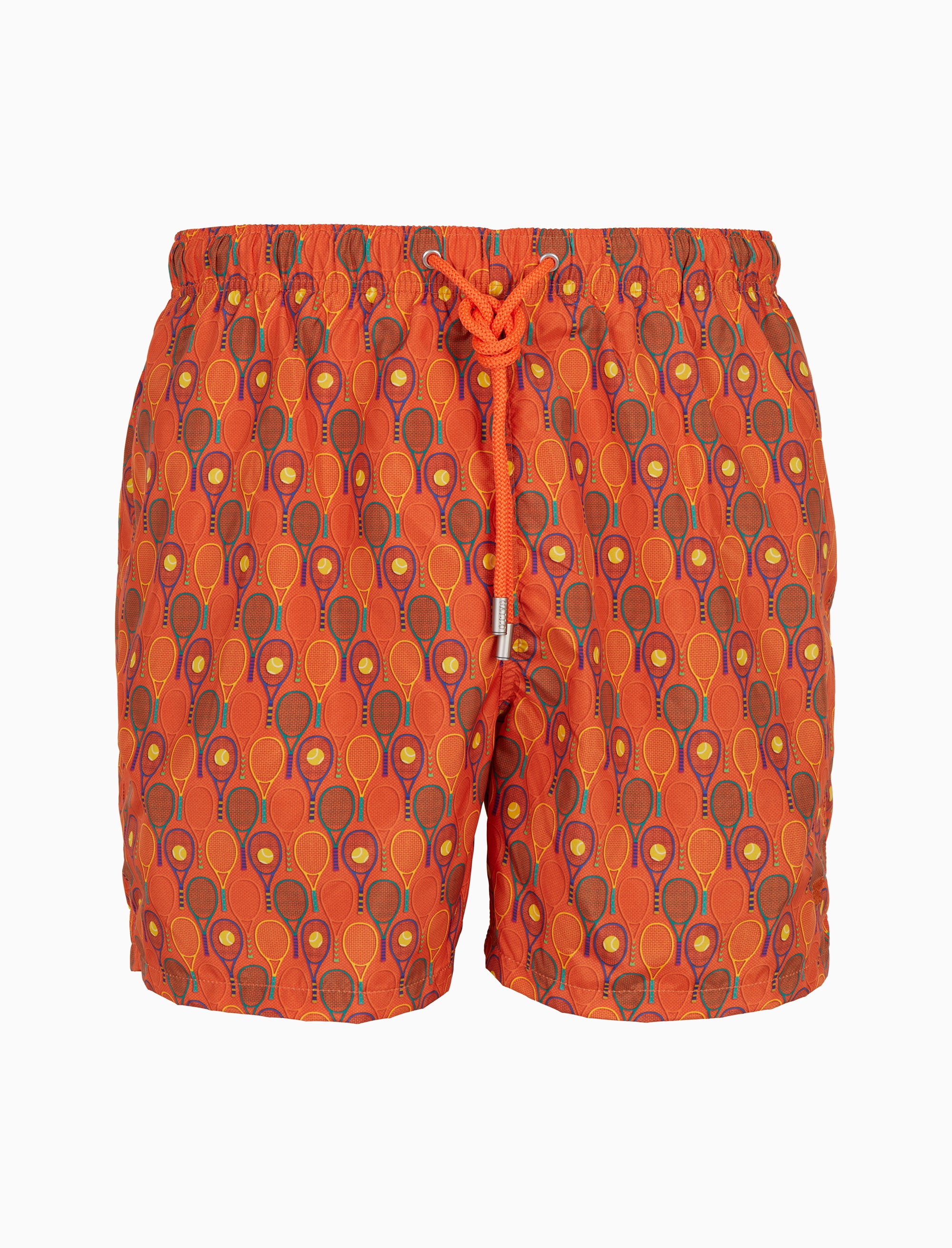 Boxer mare da uomo caratterizzati da una raffinata fantasia ispirata al mondo del tennis, in una vivace tonalità arancio. Design elegante e sofisticato, questi boxer evocano l’arte della tradizione sartoriale, offrendo comfort e stile in ogni occasione estiva.