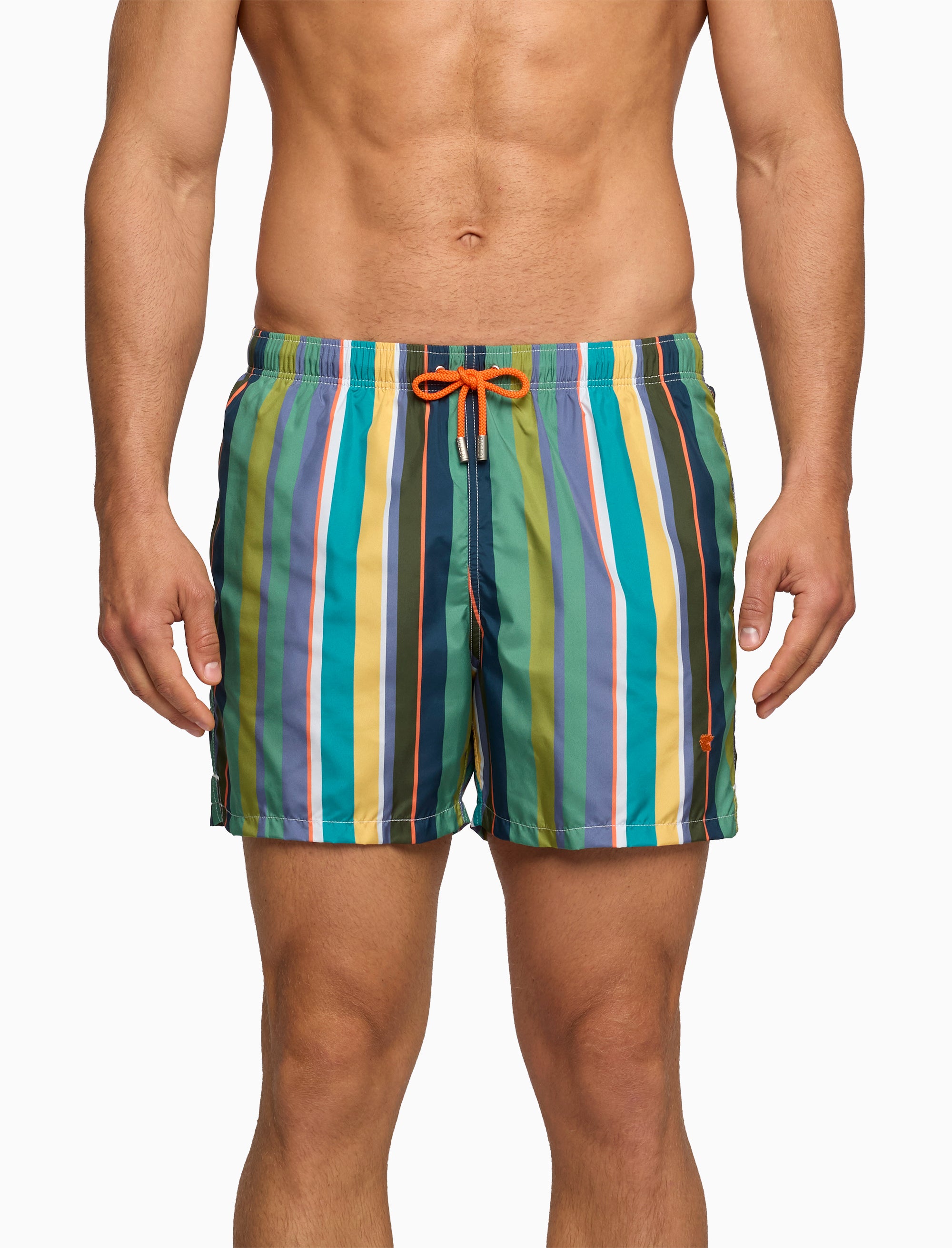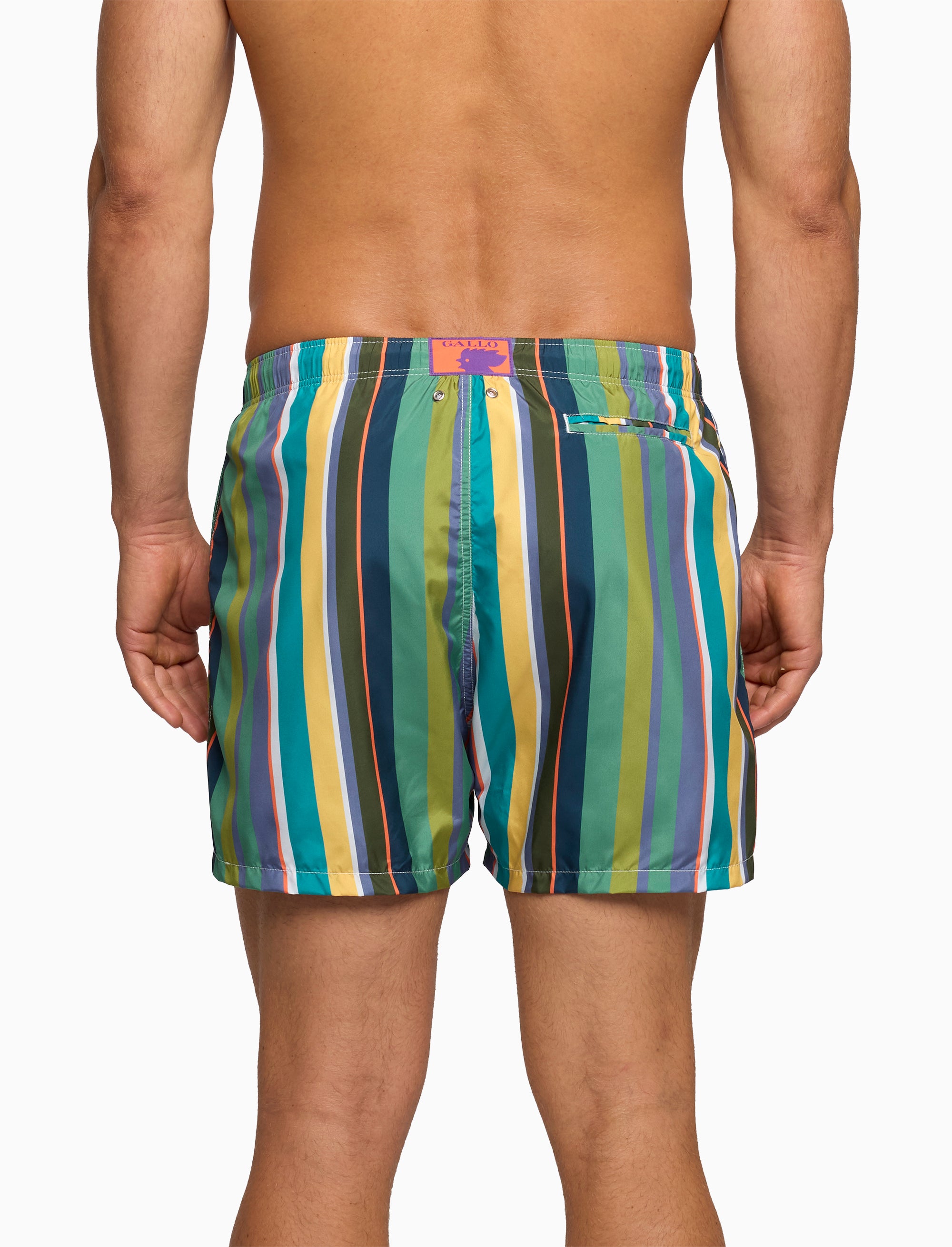 Costume da uomo modello boxer realizzato in fibra sintetica. L'elastico in vita garantisce il massimo comfort. L'iconica fantasia a righe multicolor nei toni del verde tiene fede alla tradizione Gallo, sinonimo di qualità ed eccellenza italiana dal 1927.