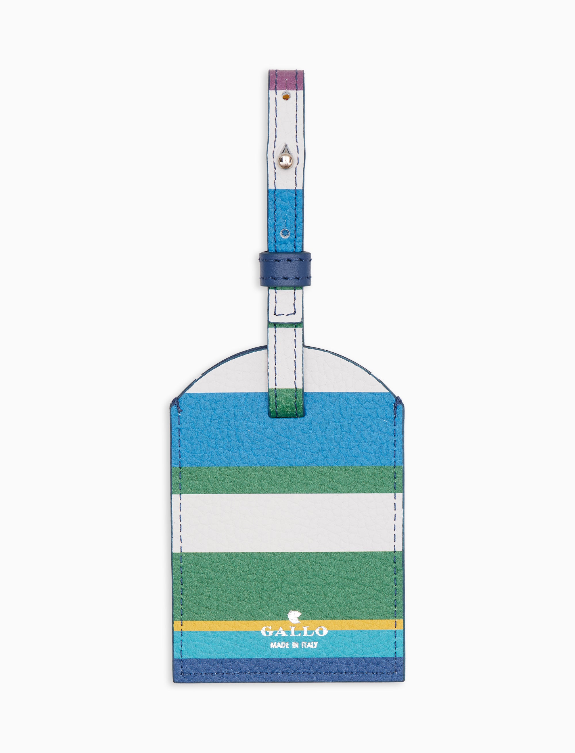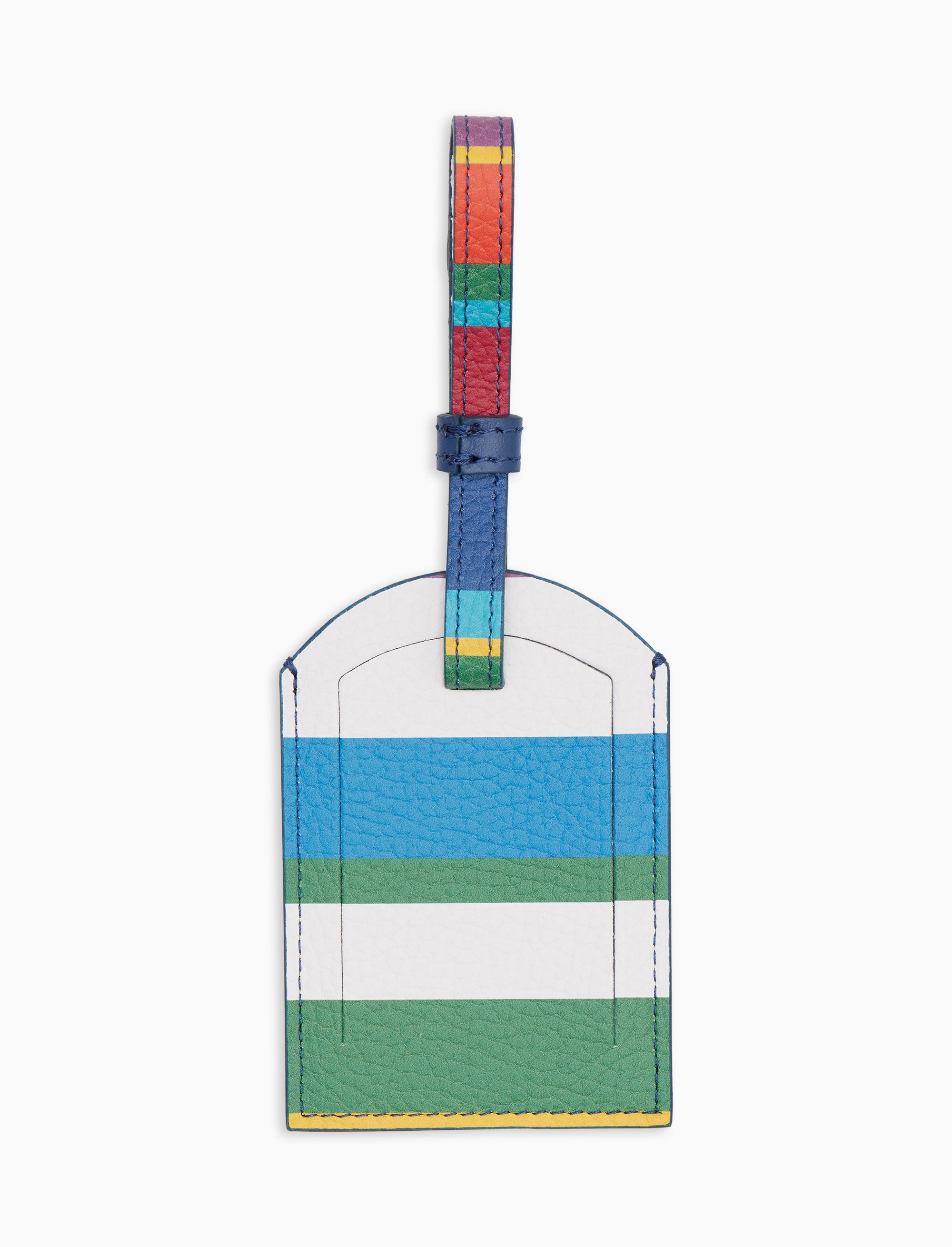 Etichetta per bagaglio unisex in pelle martellata con righe multicolor bianca. Un dettaglio elegante e distintivo per ogni valigia.