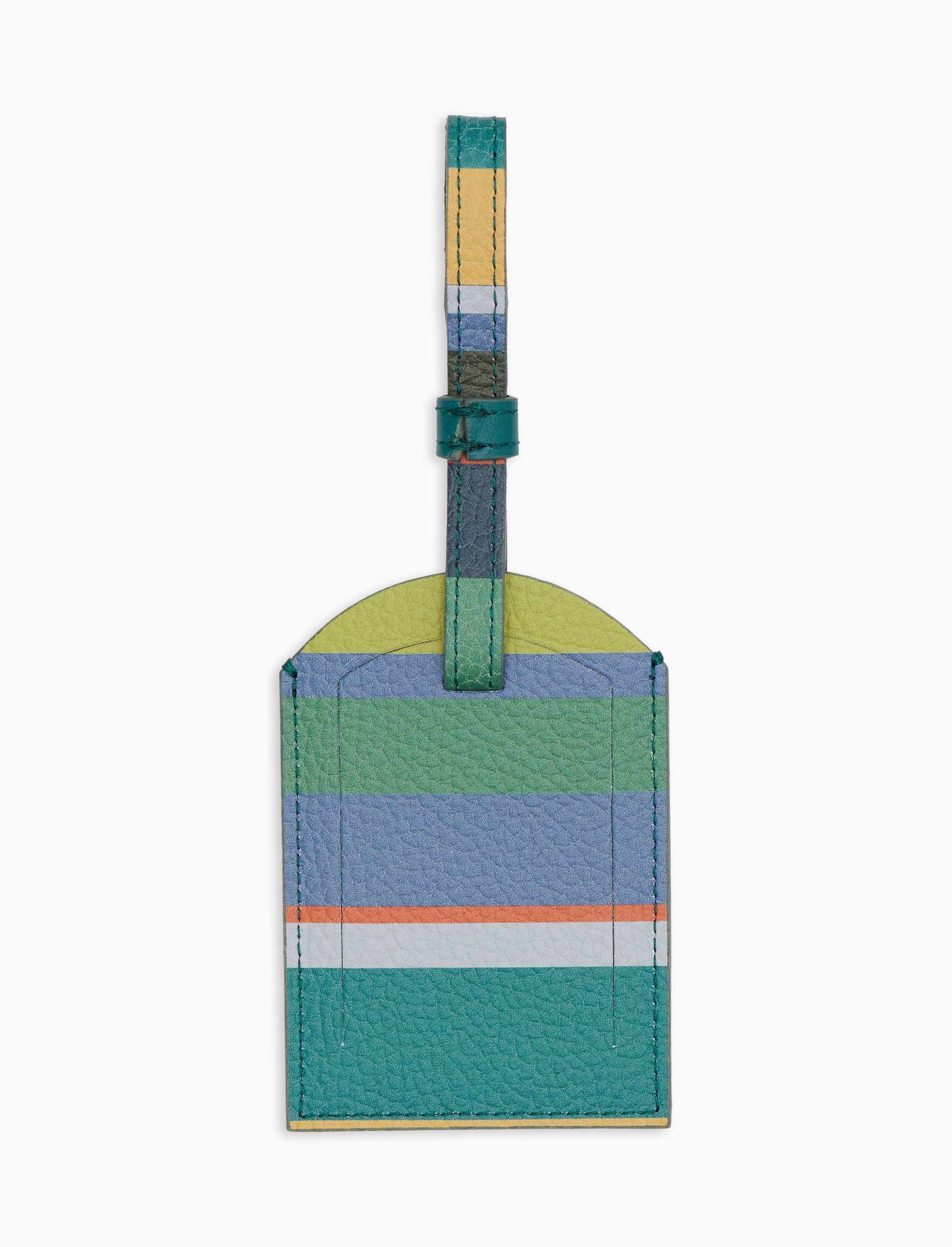 Etichetta per bagaglio unisex in pelle martellata con righe multicolor verde. Un dettaglio elegante e distintivo per ogni valigia.