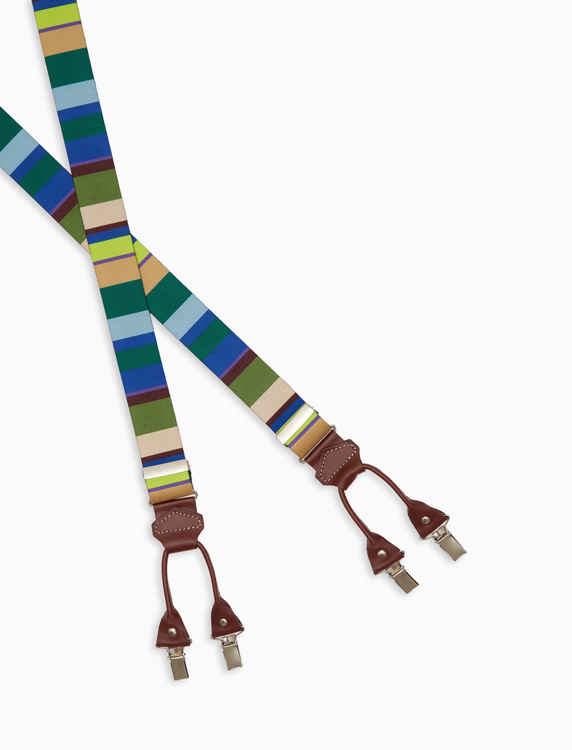 Elastic unisex green suspenders with multicoloured stripes