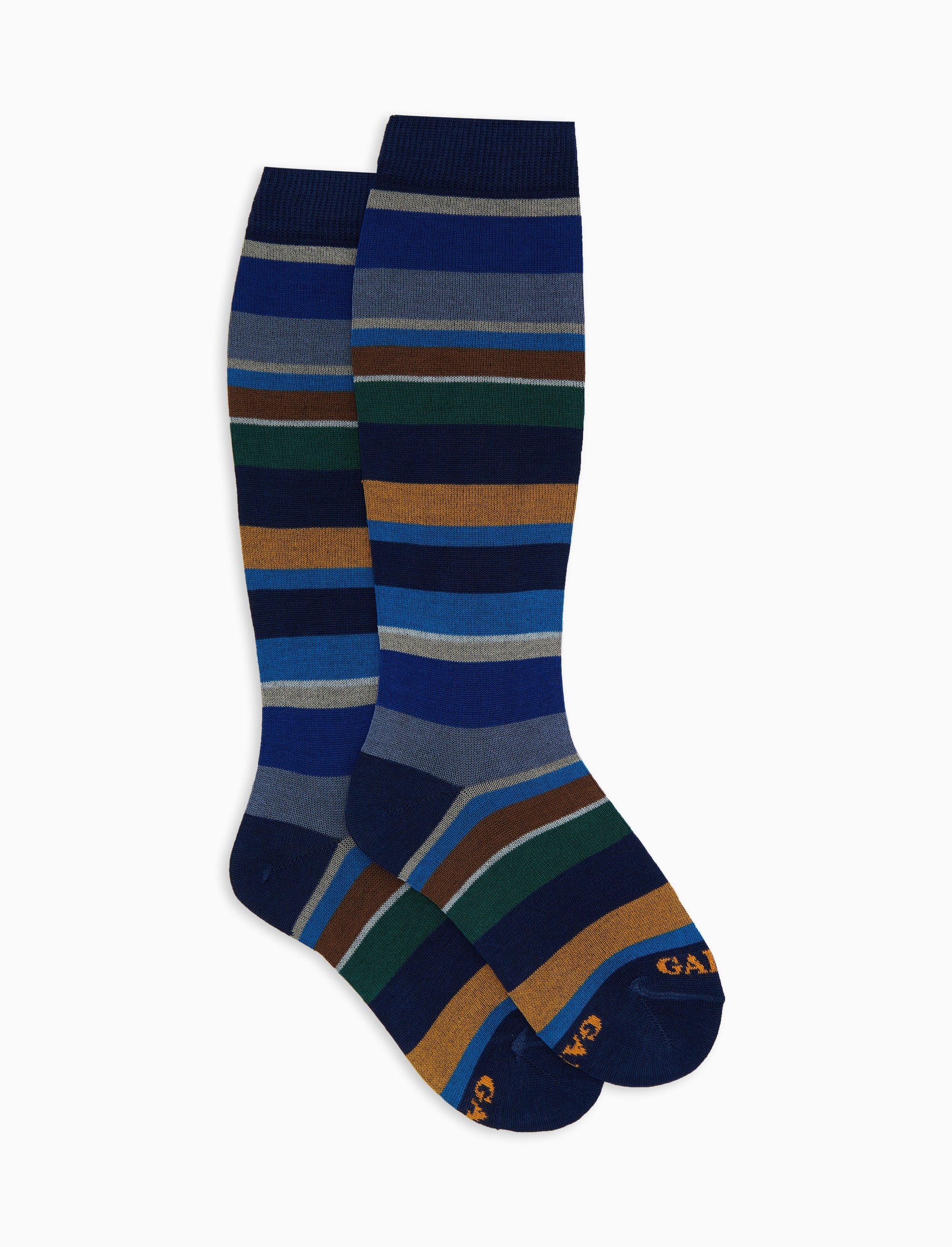 Kids' long blue cotton socks with multicoloured stripes