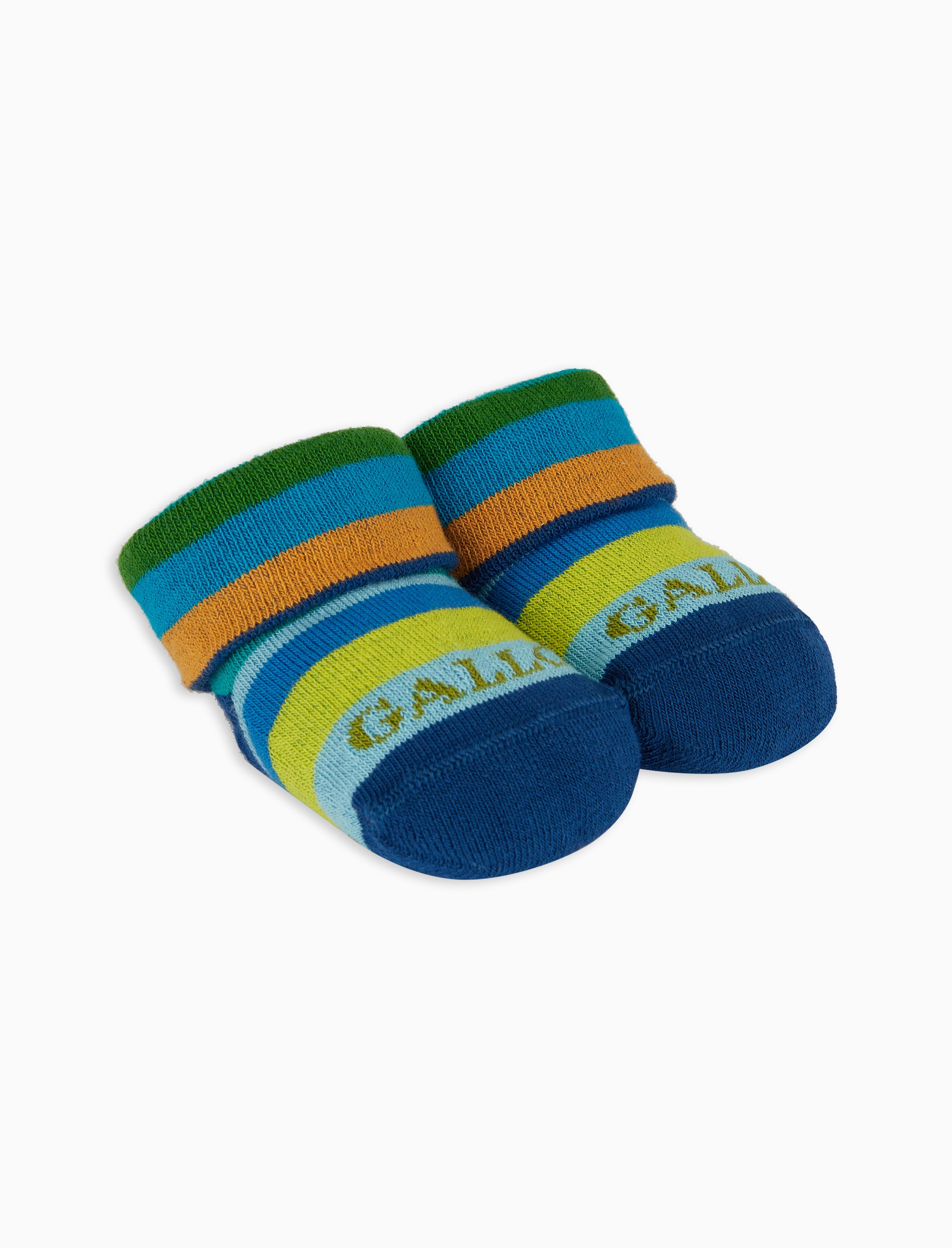 Kids' prussian blue cotton booties with multicoloured stripes
