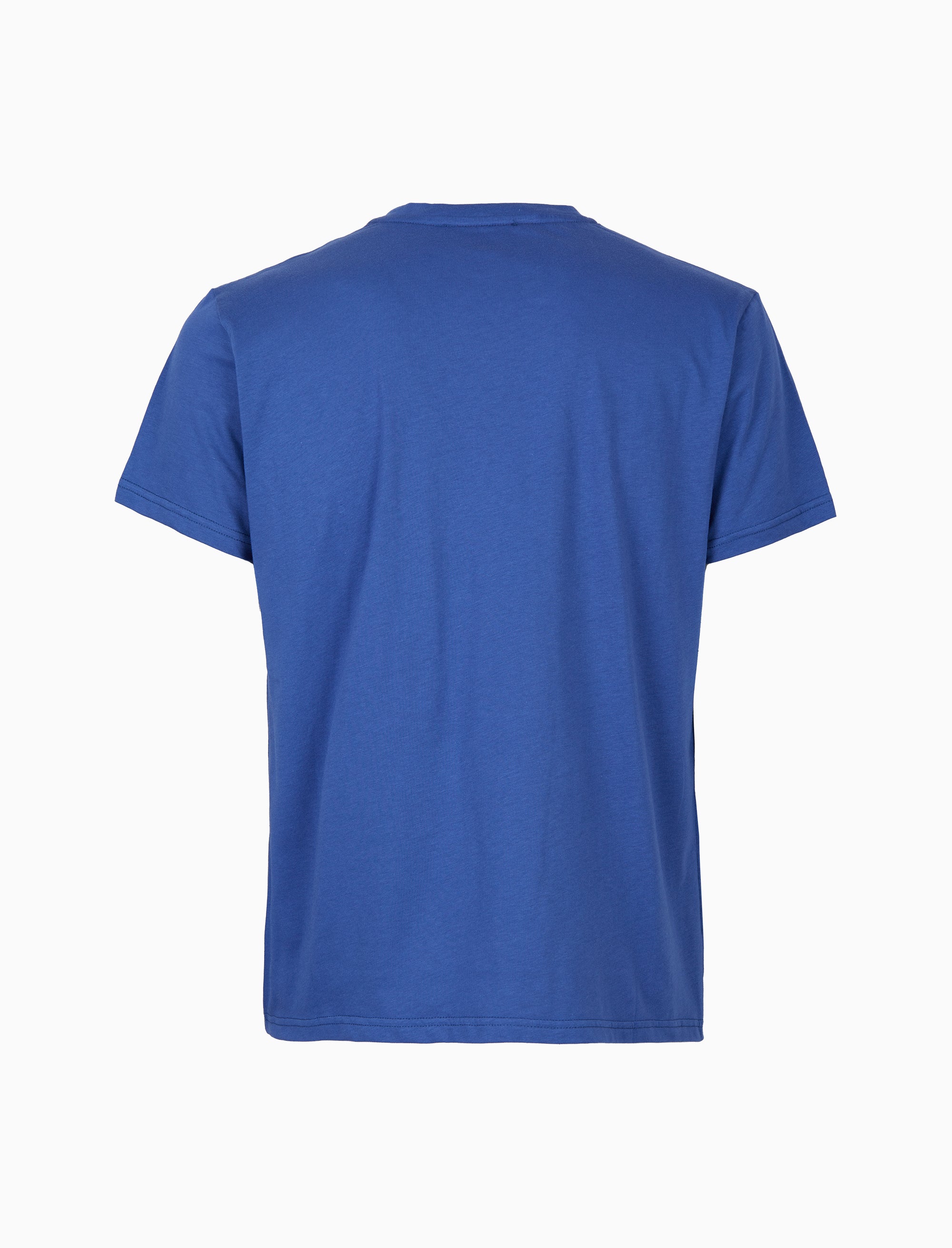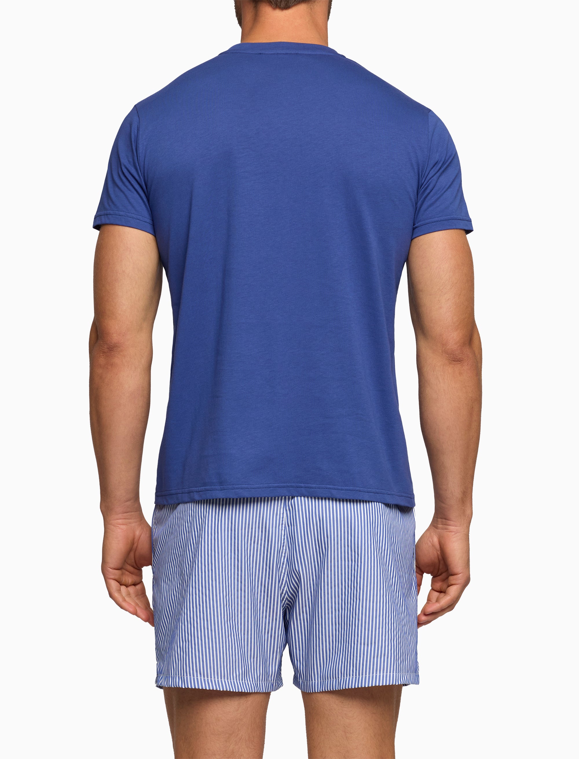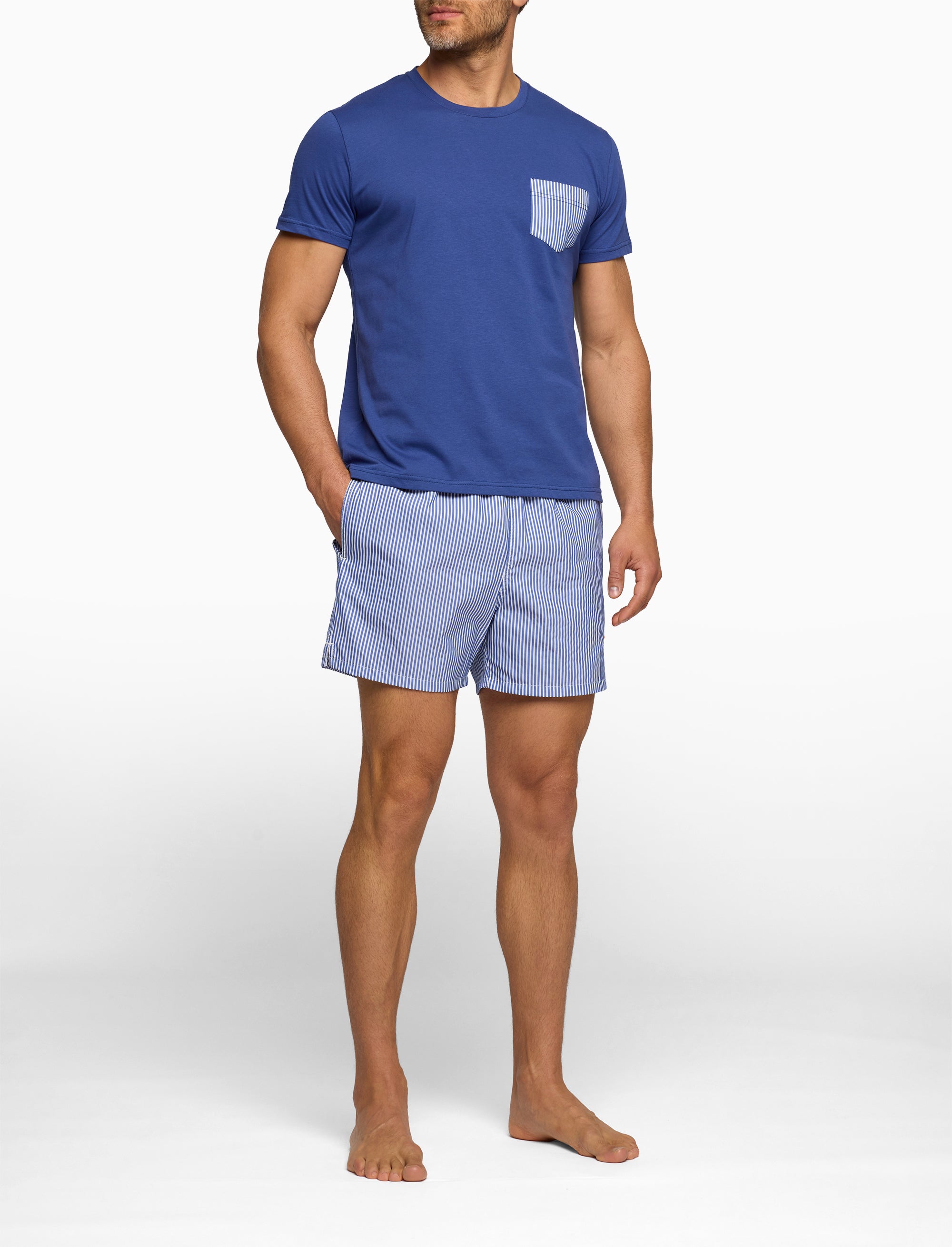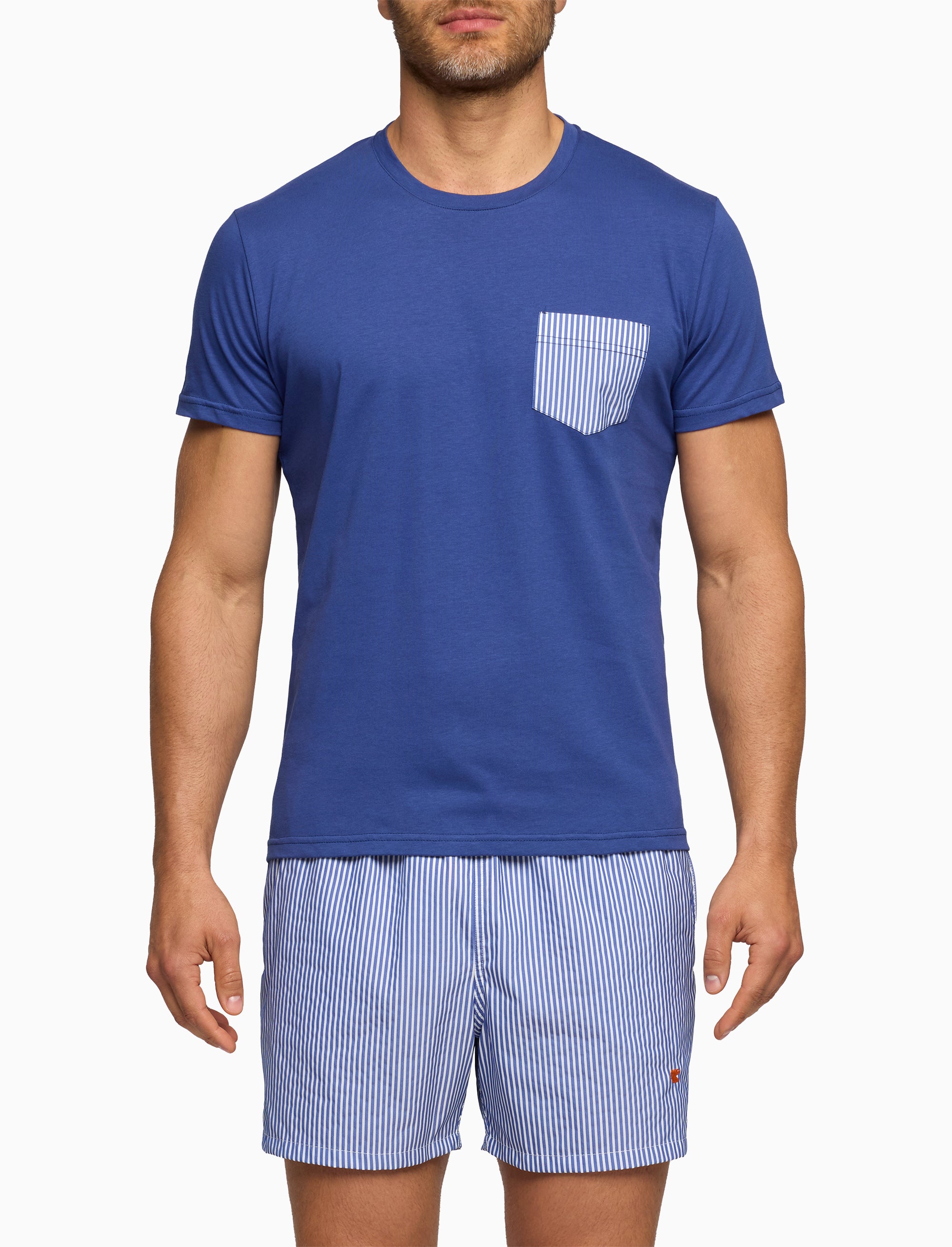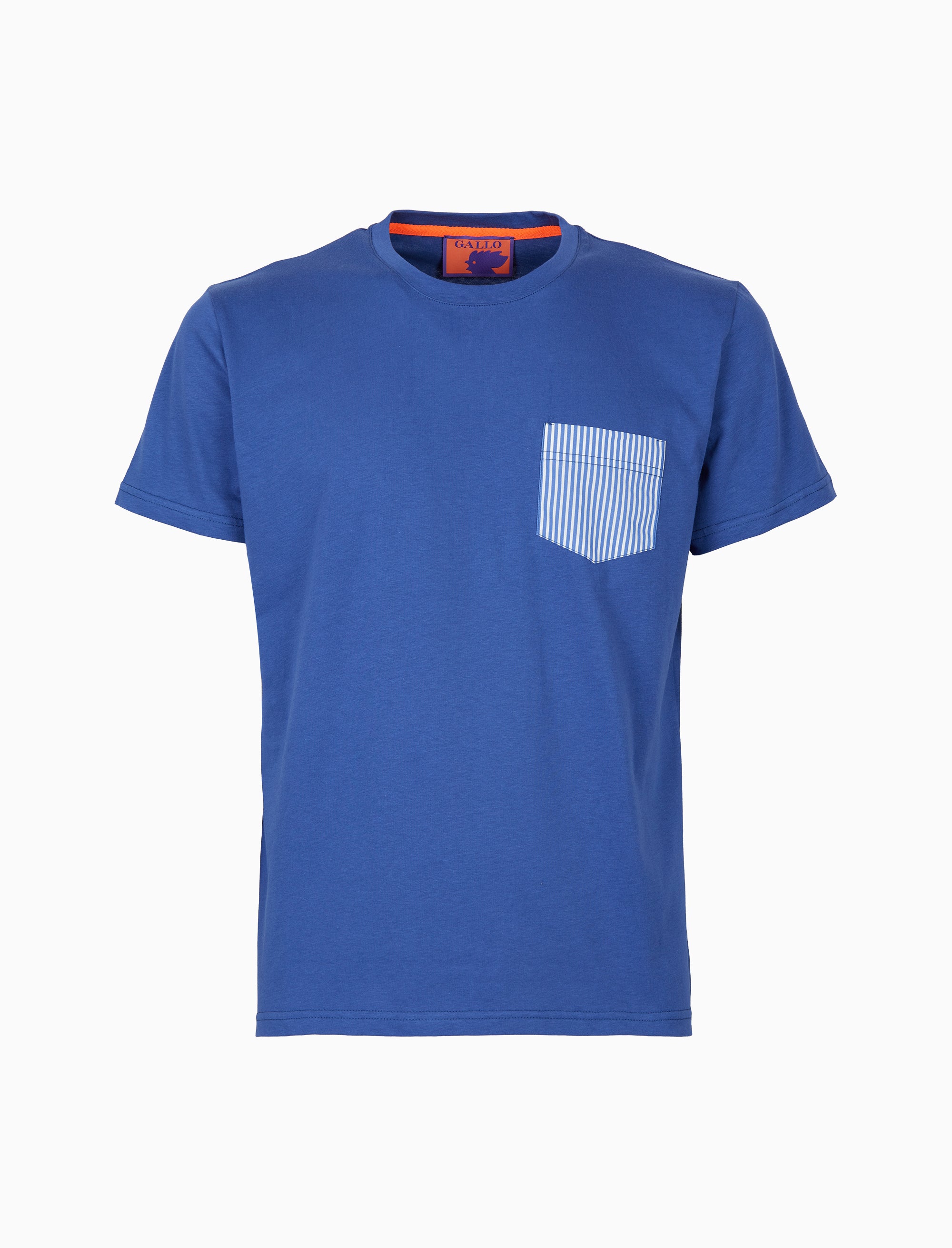Men's blue crew neck cotton t-shirt with solid color and seersucker pocket