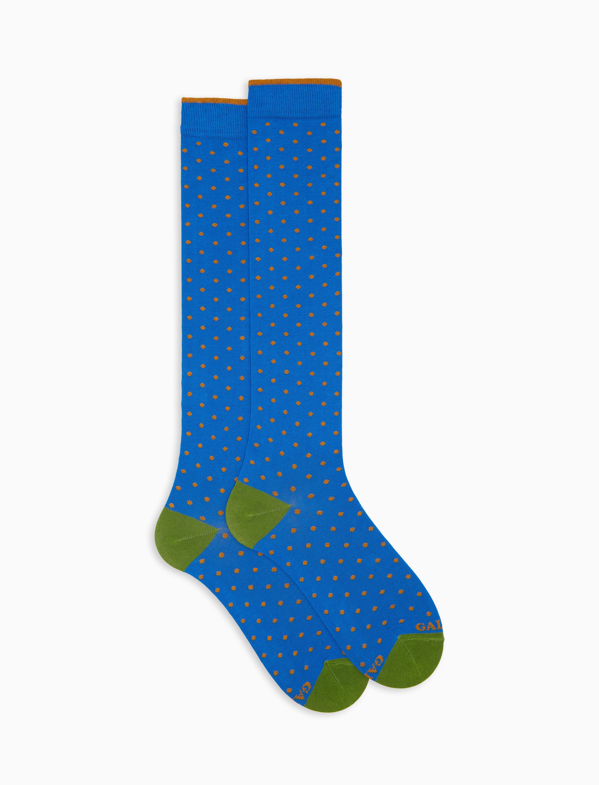 Men's long light blue cotton socks with polka dot pattern