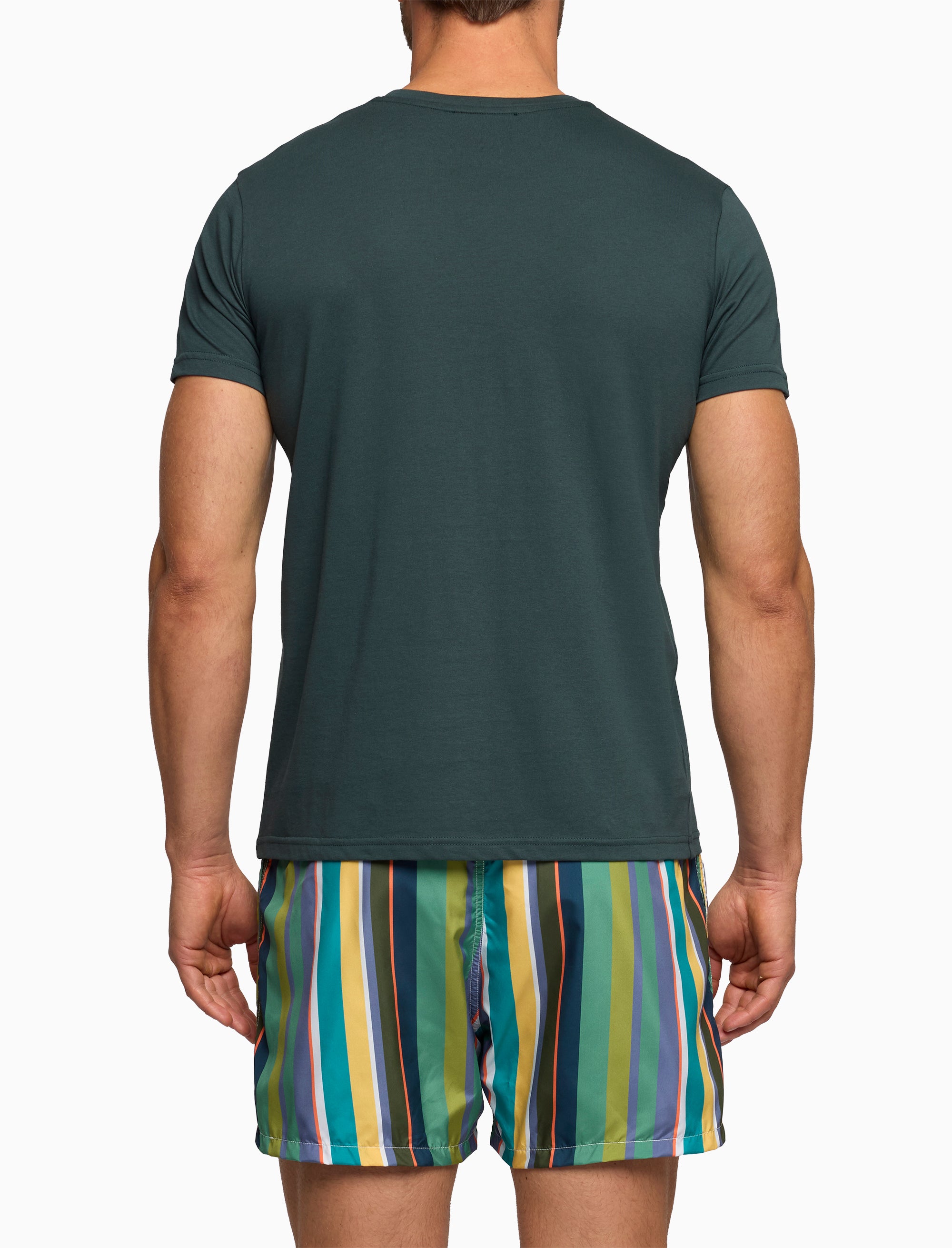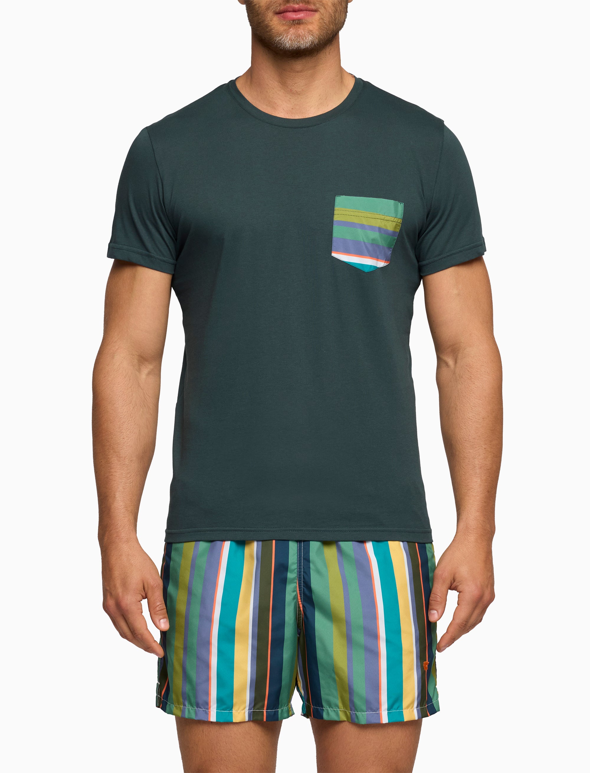 Men's plain green cotton T-shirt with multicoloured breast pocket