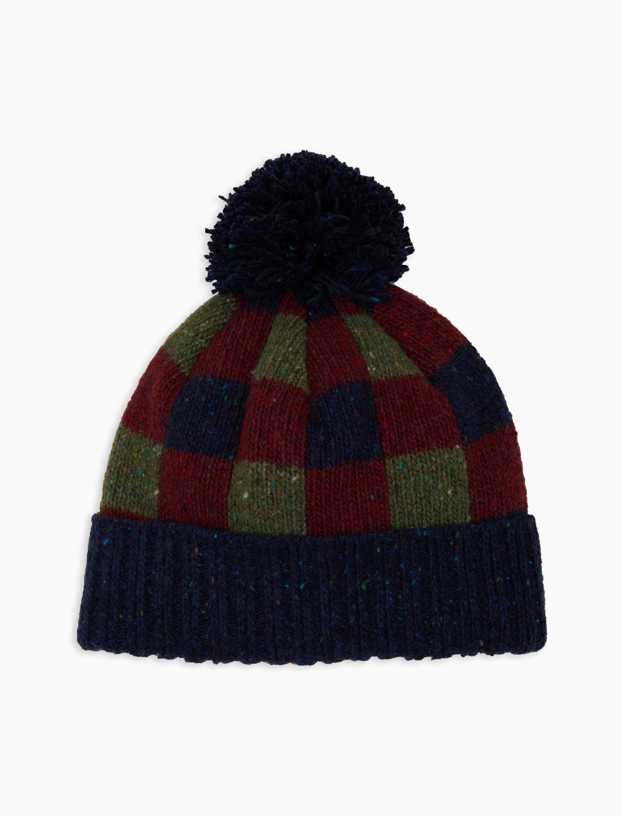 Unisex blue wool beanie with cuff, pompom and chessboard motif
