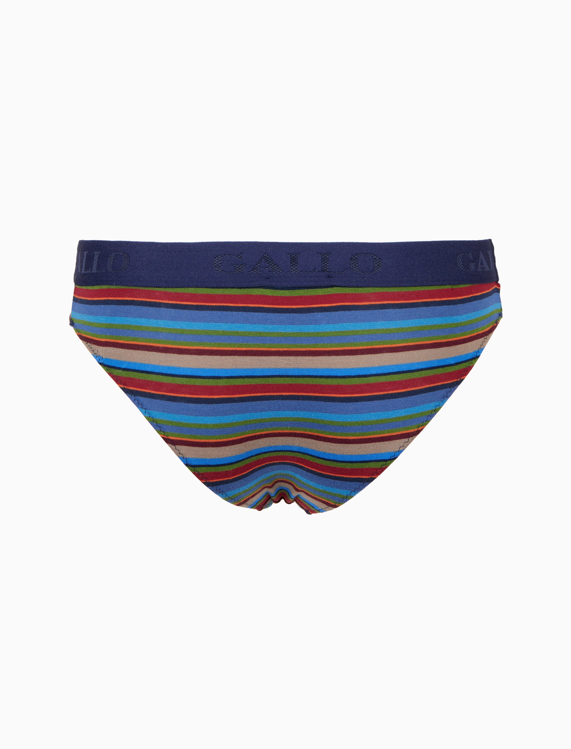 Women's briefs in soft cotton, embellished with a lively multicoloured striped pattern on a blue background. Everyday comfort and distinctive style come together in this Gallo piece, synonymous with Italian craftsmanship since 1927.