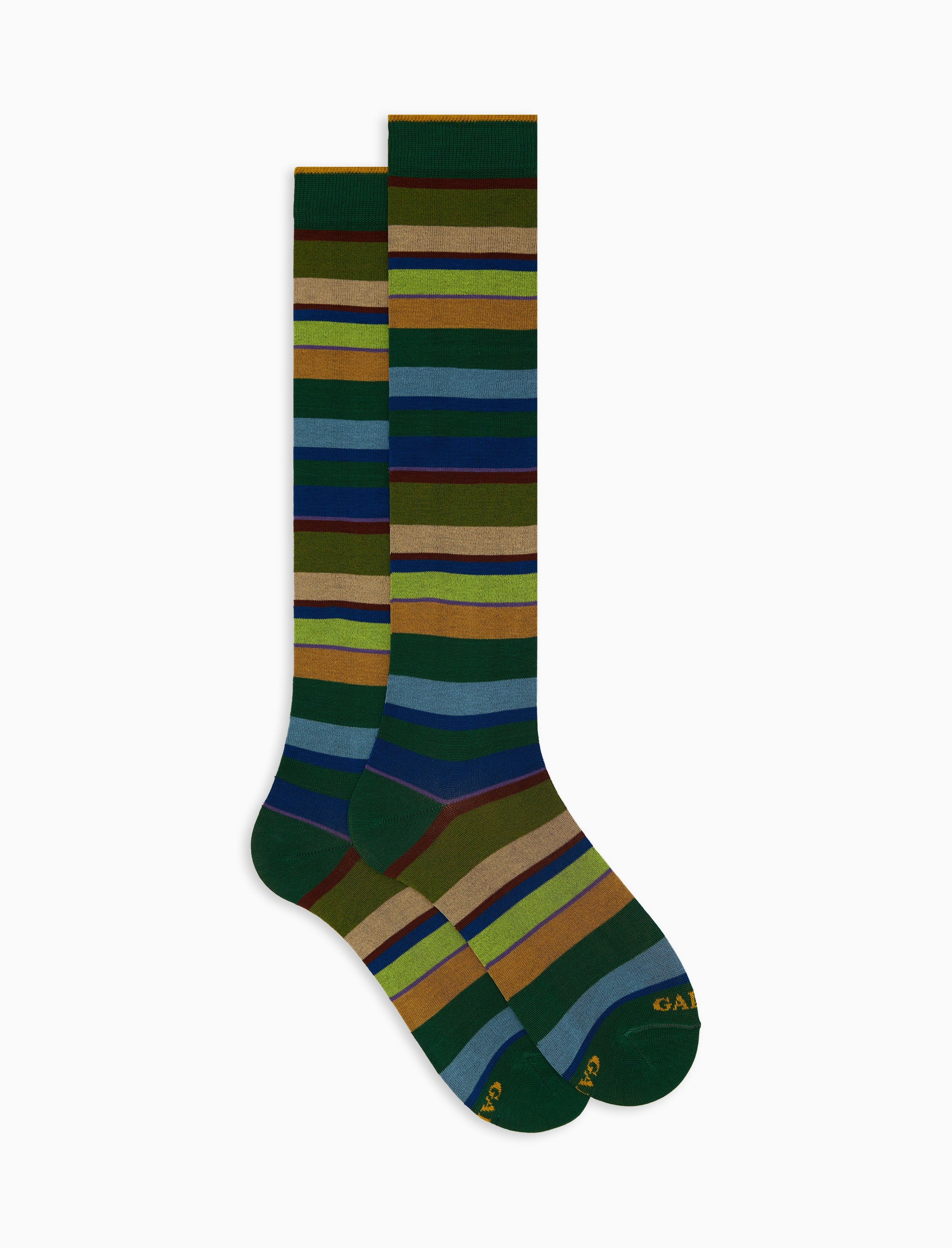 Women's long green cotton socks with multicoloured stripes