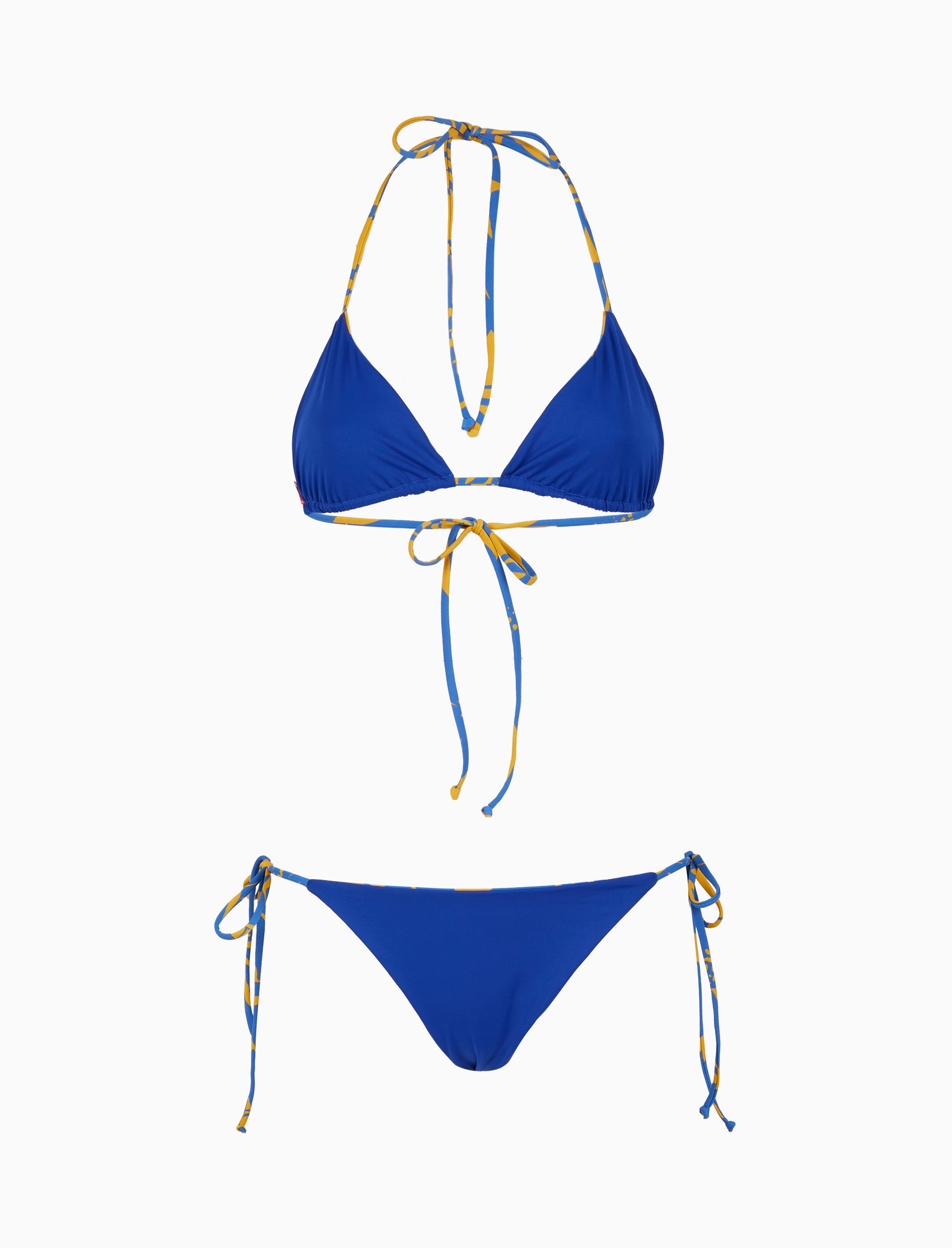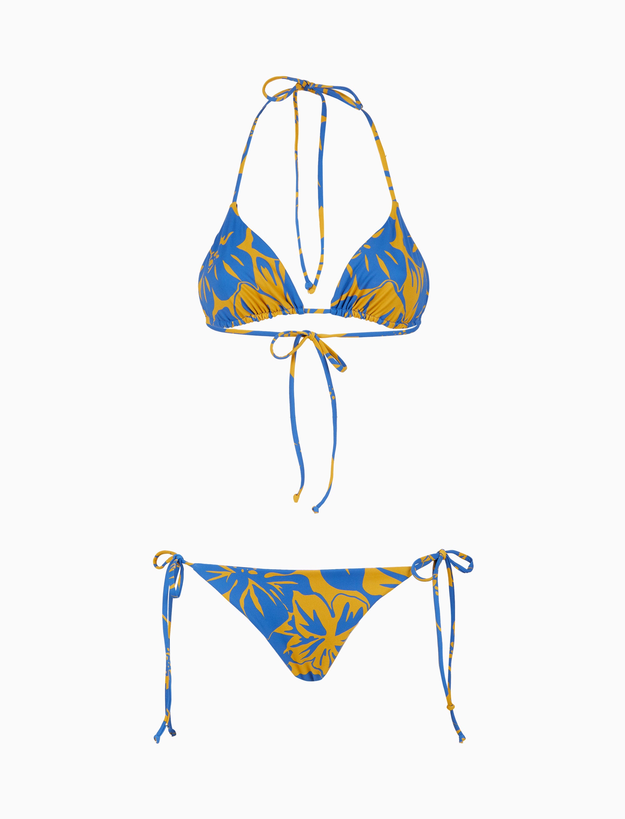 Women's reversible triangle bikini with a yellow floral design. Perfect for a sunny and lively look.