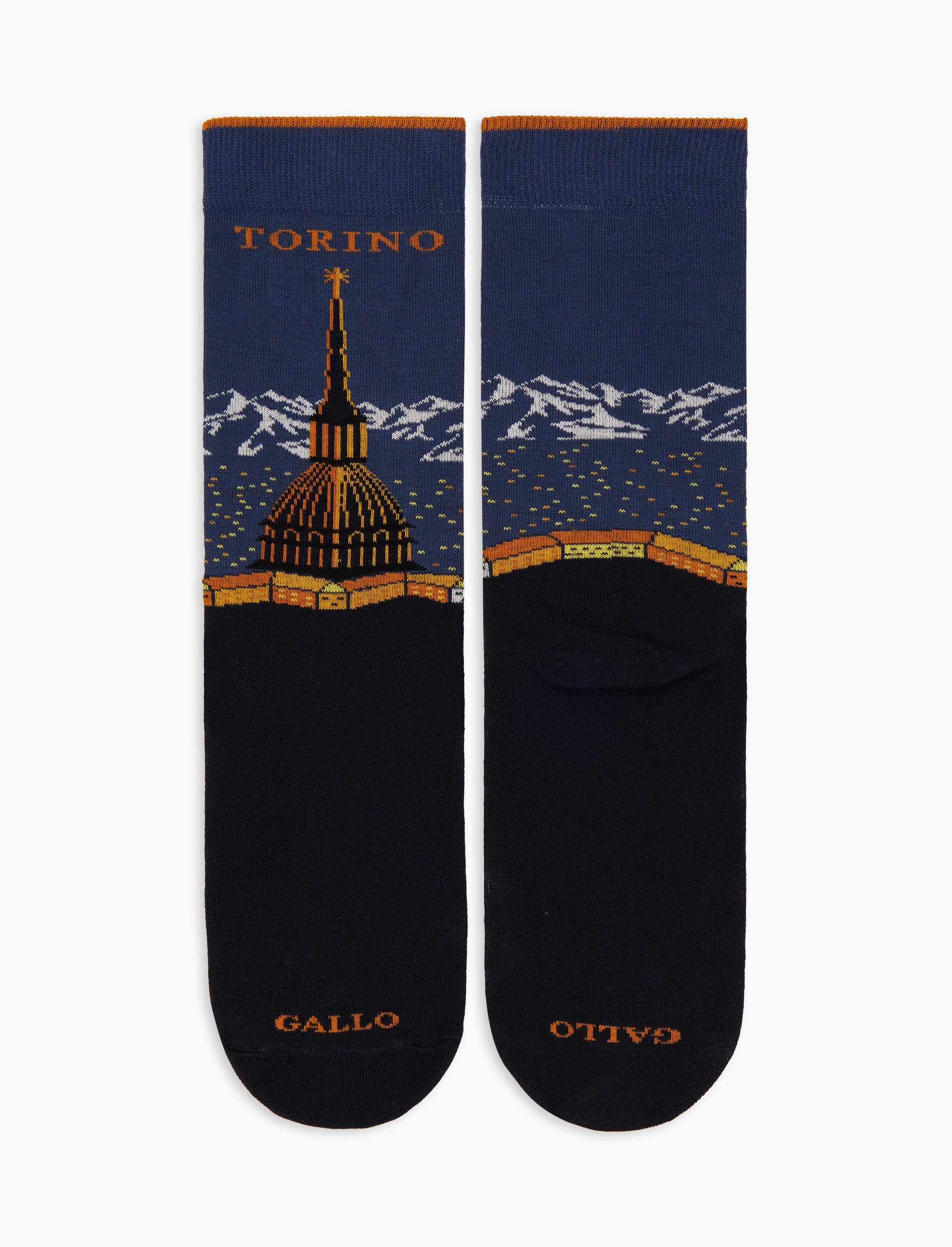 Calze corte da donna realizzate in Italia in cotone sui toni del blu. Morbide al tatto garantiscono un estremo comfort. E' stata rappresentata l'icona di Torino, la Mole Antonelliana, nello stile distintivo di Gallo che rende queste calze un vero accessorio di design. Perfette da indossare tutti i giorni o per sdrammatizzare un look formale.