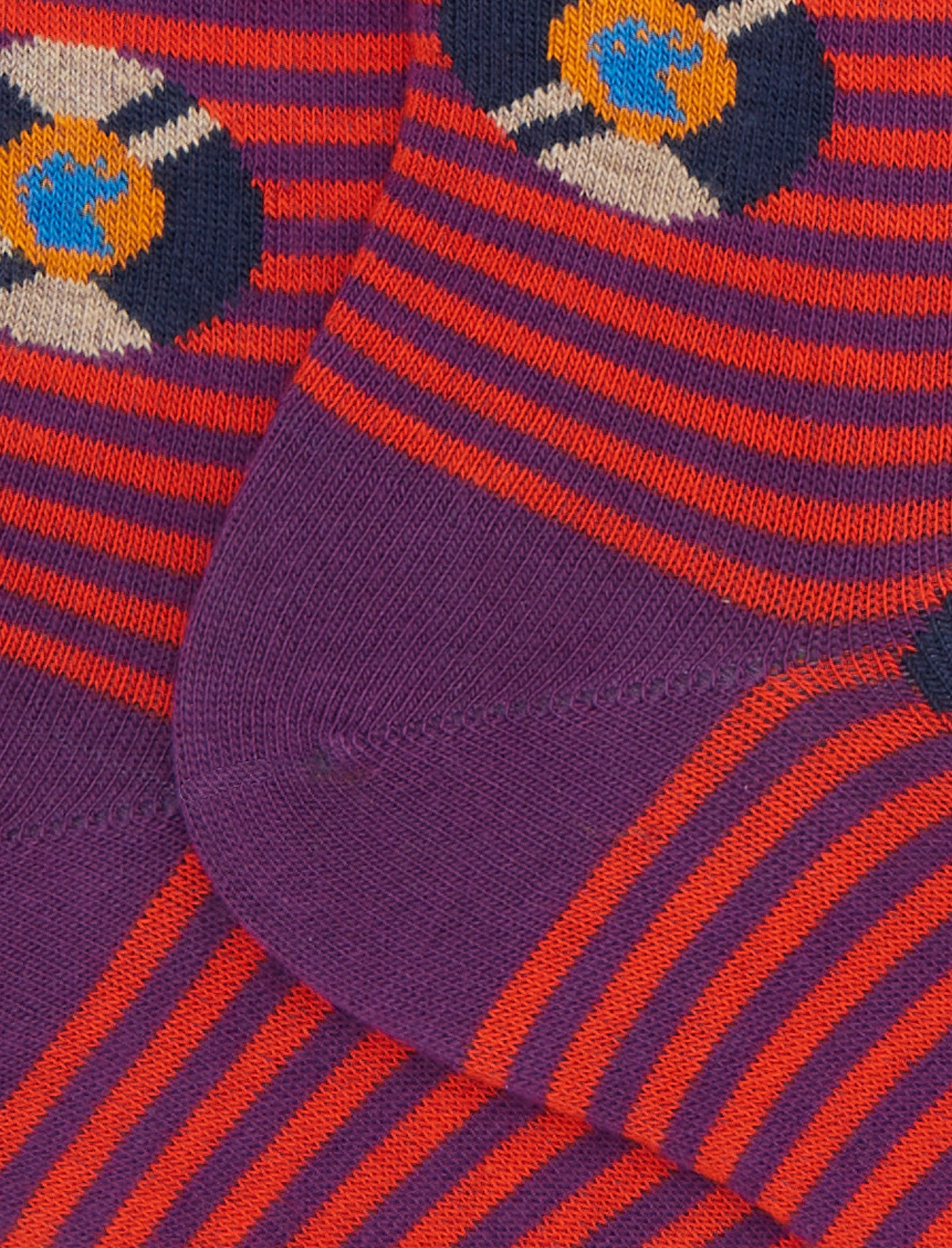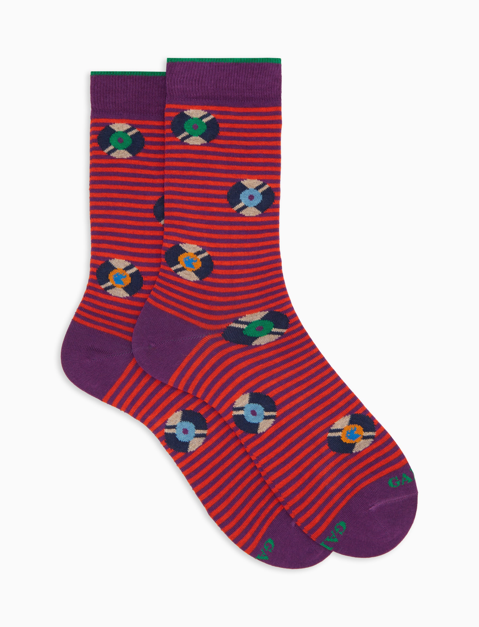 Calze corte da donna in cotone viola, decorate con una fantasia ispirata ai dischi in vinile. Ideali per completare un look creativo e ricercato. Un capo firmato Gallo, eccellenza italiana dal 1927