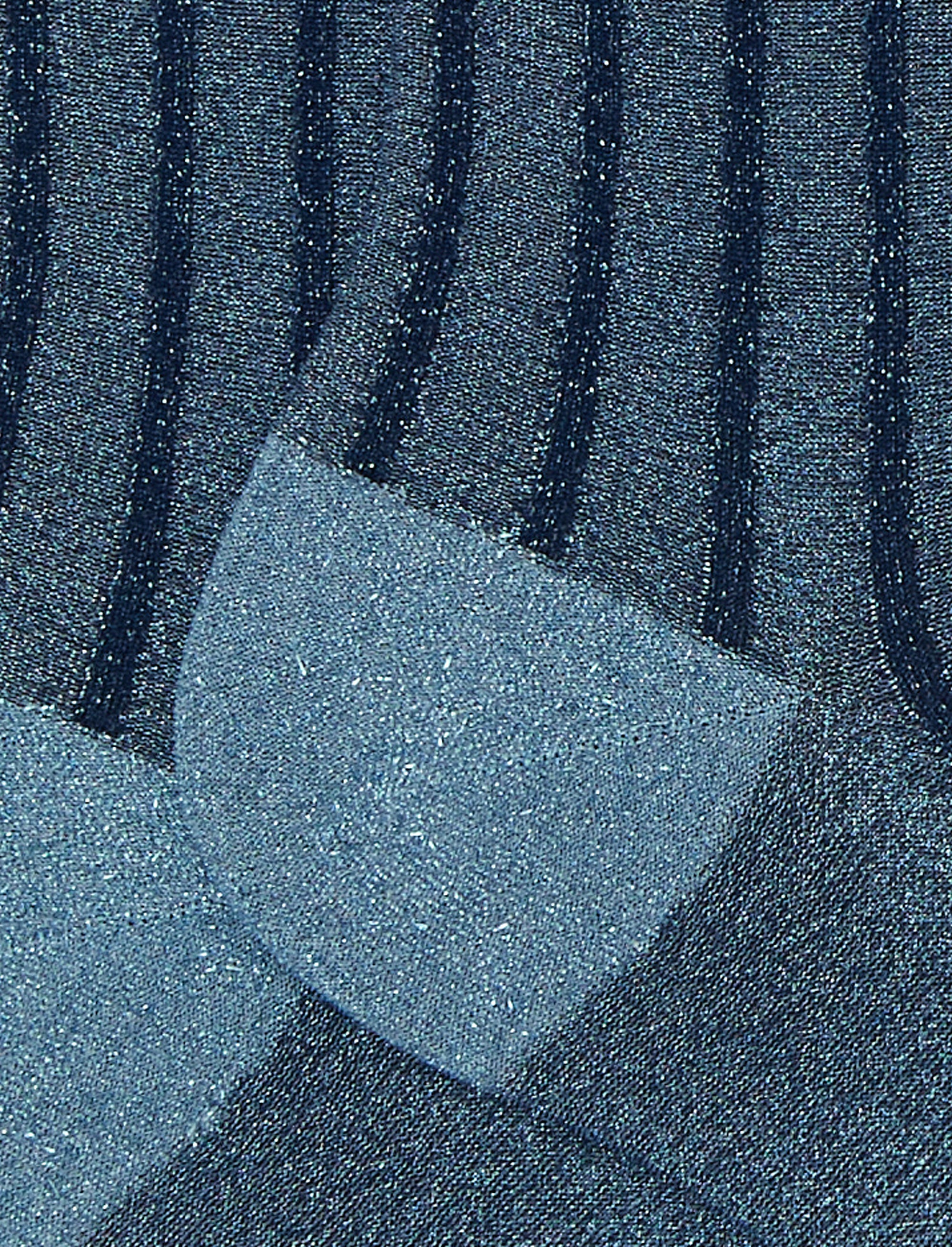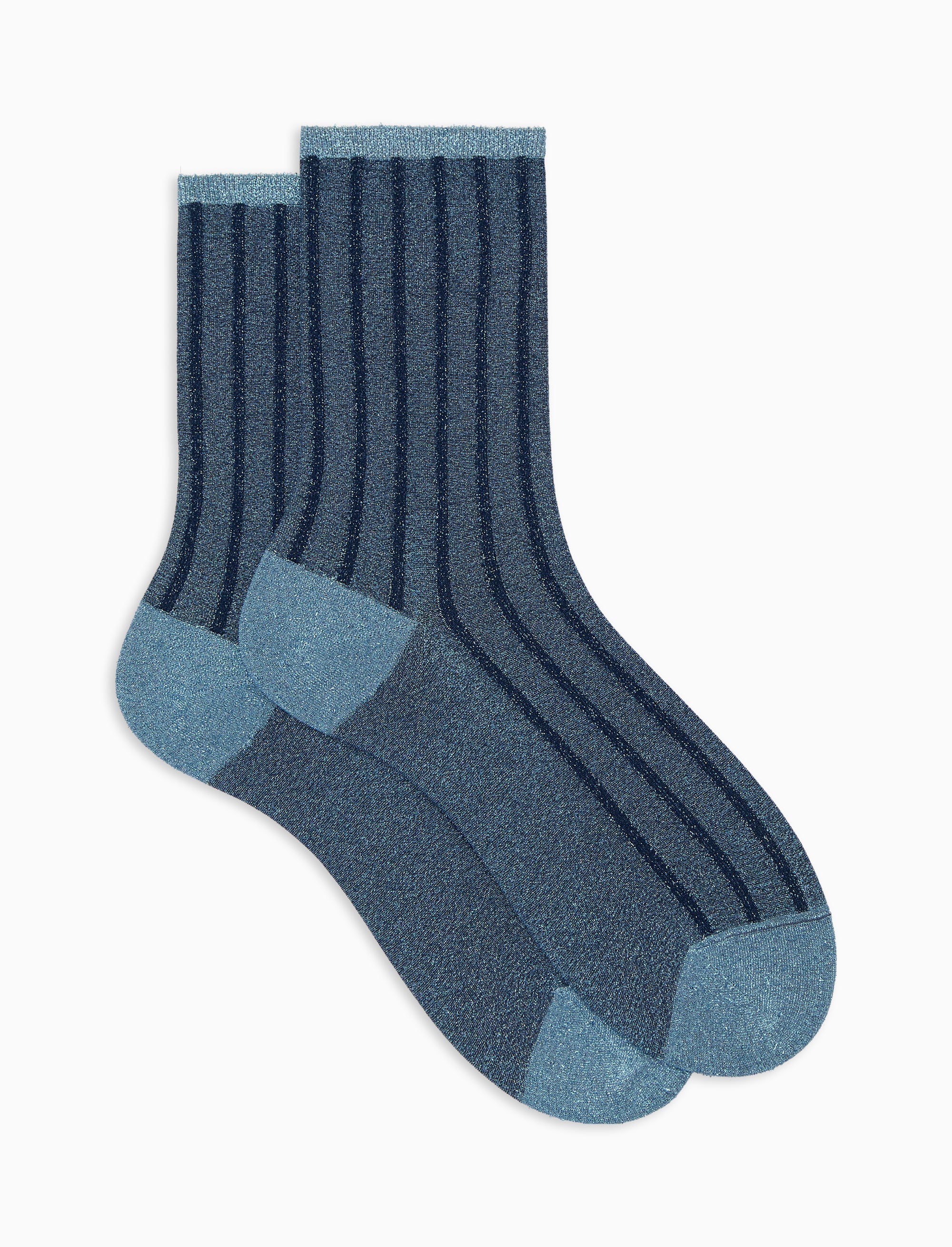 Calze corte da donna realizzate in Italia in fibra sintetica. L'iconica trama a coste, fantasia twin rib con effetto lurex nei toni dell'azzurro polvere e del blu, rende queste calze un vero tocco di stile, perfetto per rendere unico ogni look. Punta e tallone rinforzato a contrasto.