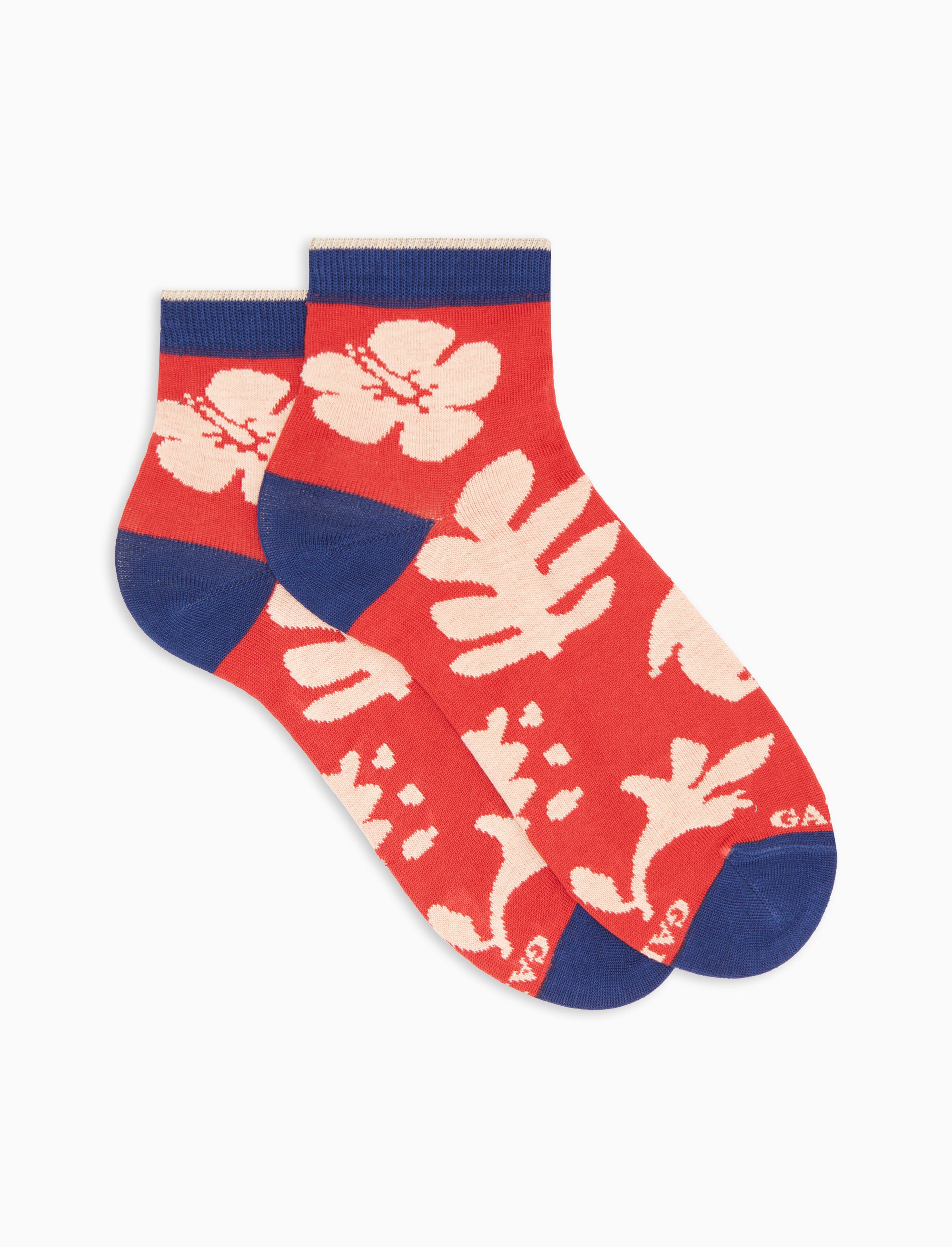Calze cortissime donna cotone fantasia fiori su fondo rosso