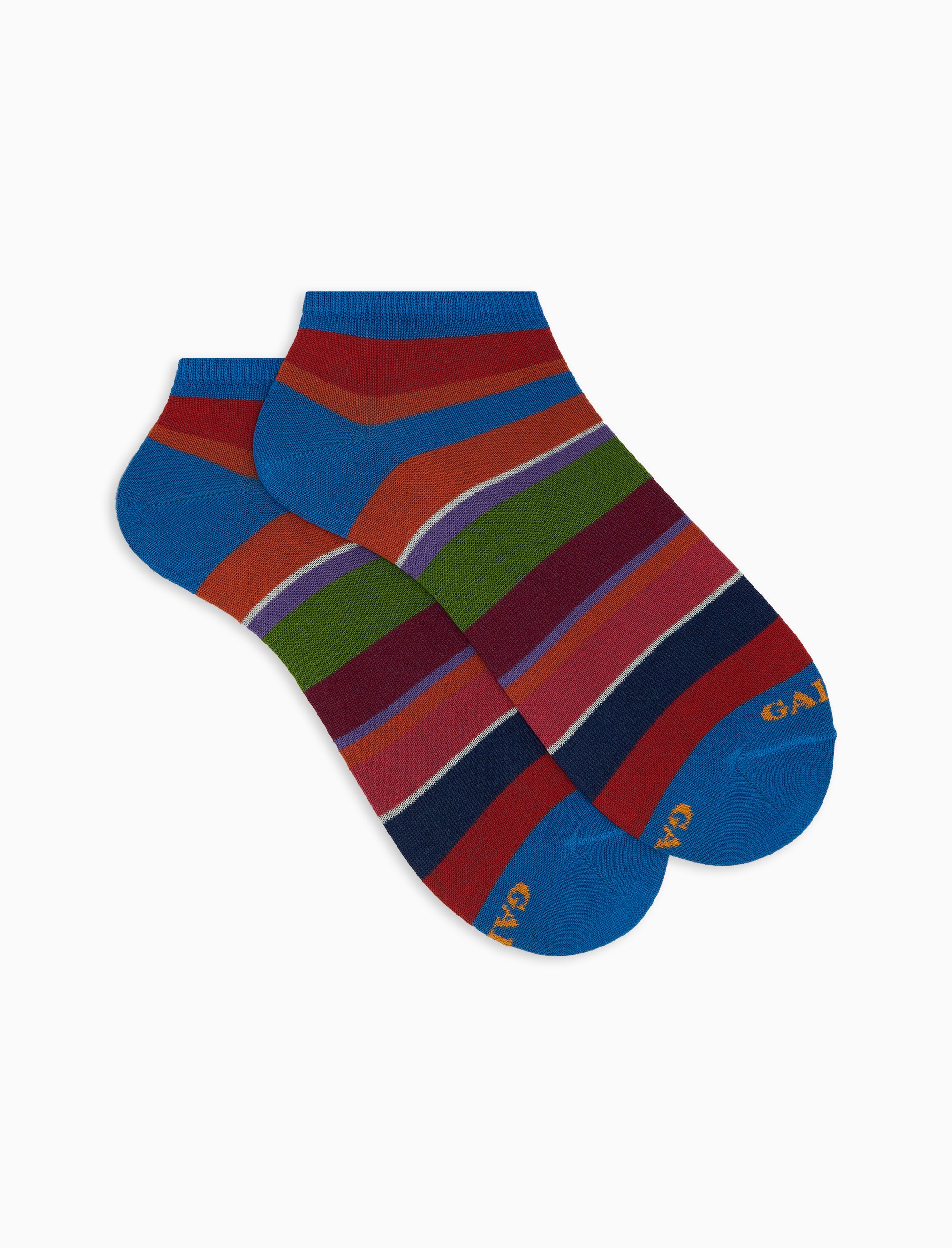 Calze modello fantasmini da donna realizzate in Italia in morbidissimo cotone leggero elasticizzato. L'iconica fantasia a righe multicolor, su base azzurra, rende queste calze immediatamente riconoscibili e perfette da abbinare ad ogni tipo di look. Il brand Gallo è ricamato in punta a contrasto. Sinonimo di qualità ed eccellenza dal 1927.