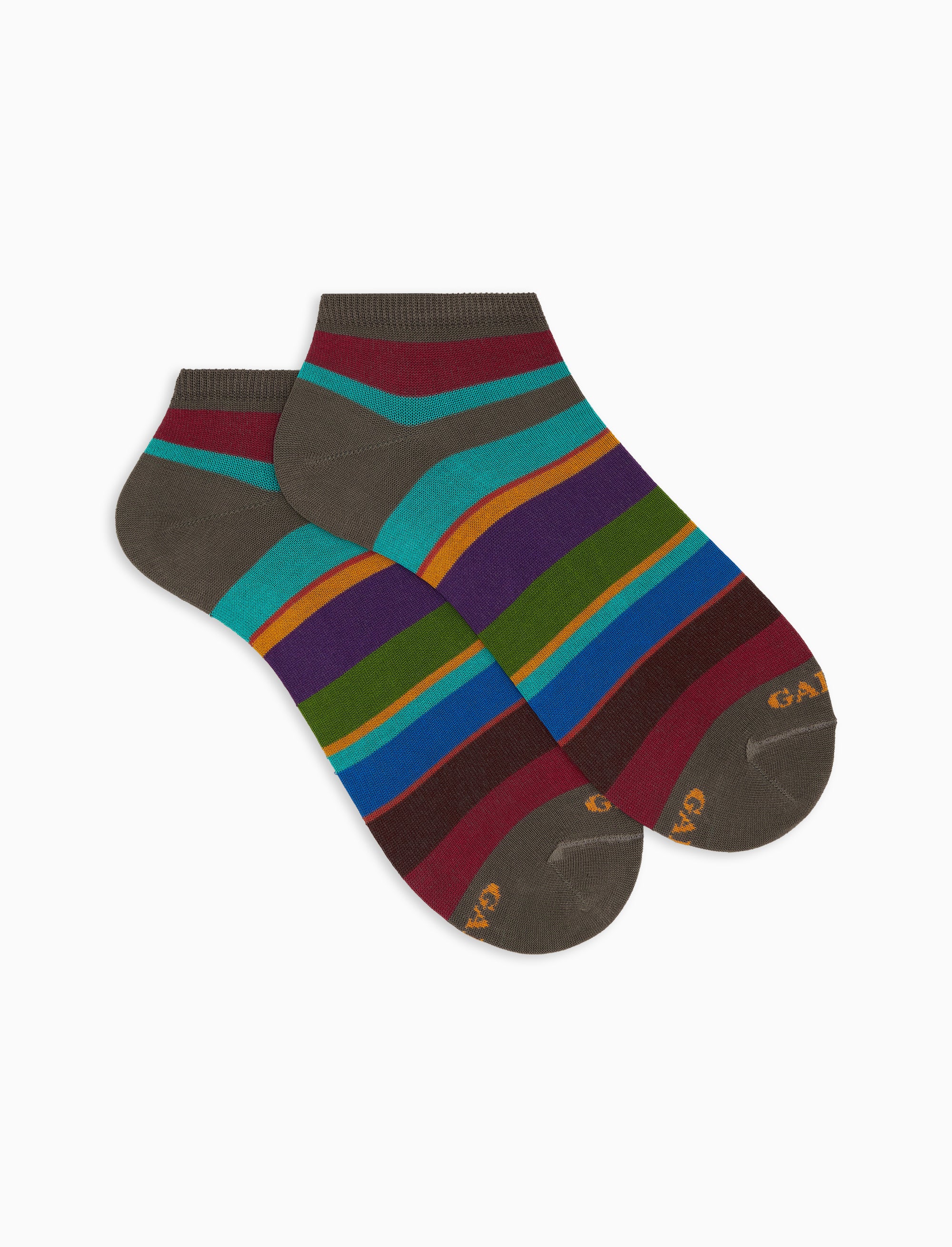 Calze modello fantasmini da donna realizzate in Italia in morbidissimo cotone leggero elasticizzato. L'iconica fantasia a righe multicolor, su base marrone, rende queste calze immediatamente riconoscibili e perfette da abbinare ad ogni tipo di look. Il brand Gallo è ricamato in punta a contrasto. Sinonimo di qualità ed eccellenza dal 1927.