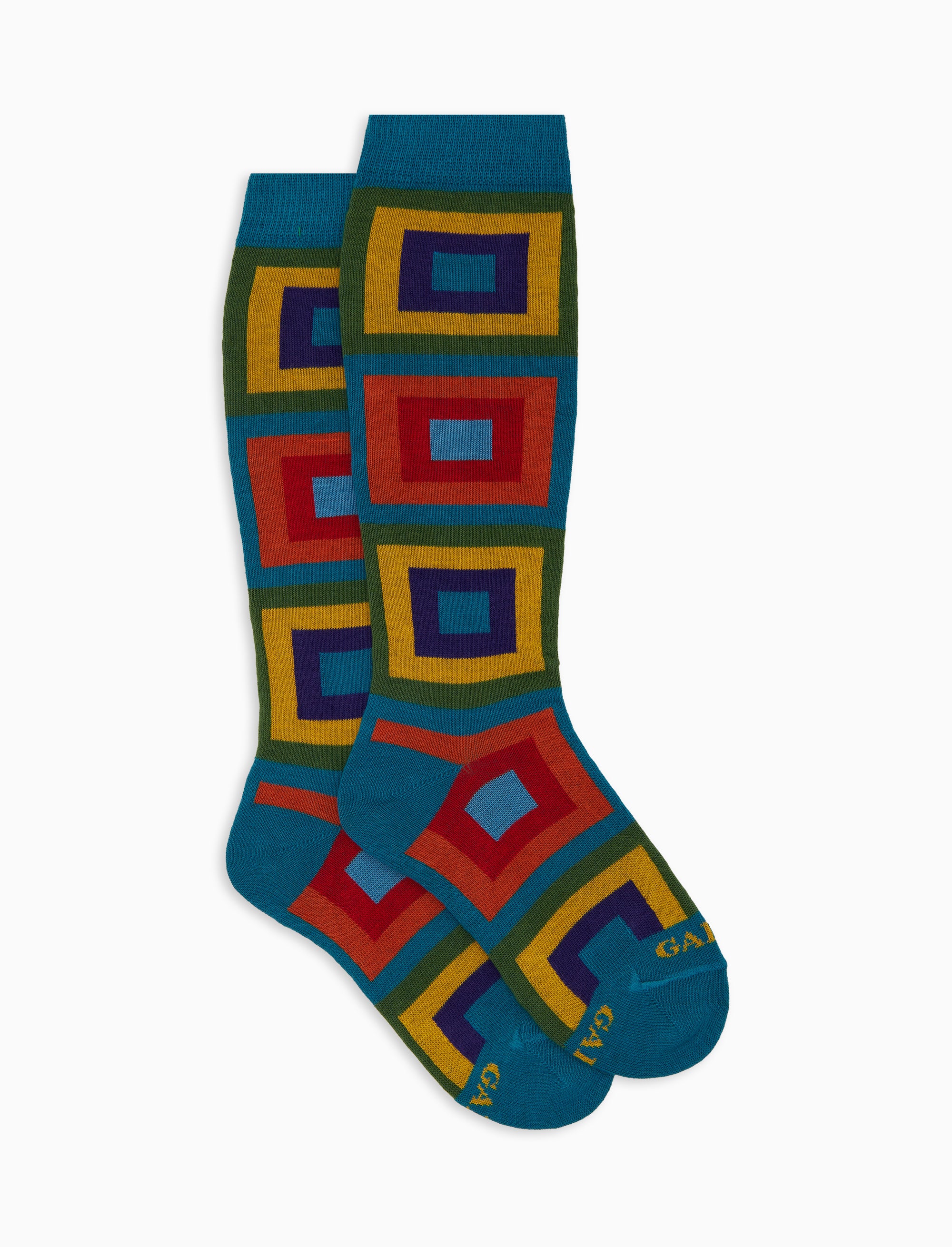 Calze lunghe bambino cotone azzurro fantasia quadri concentrici