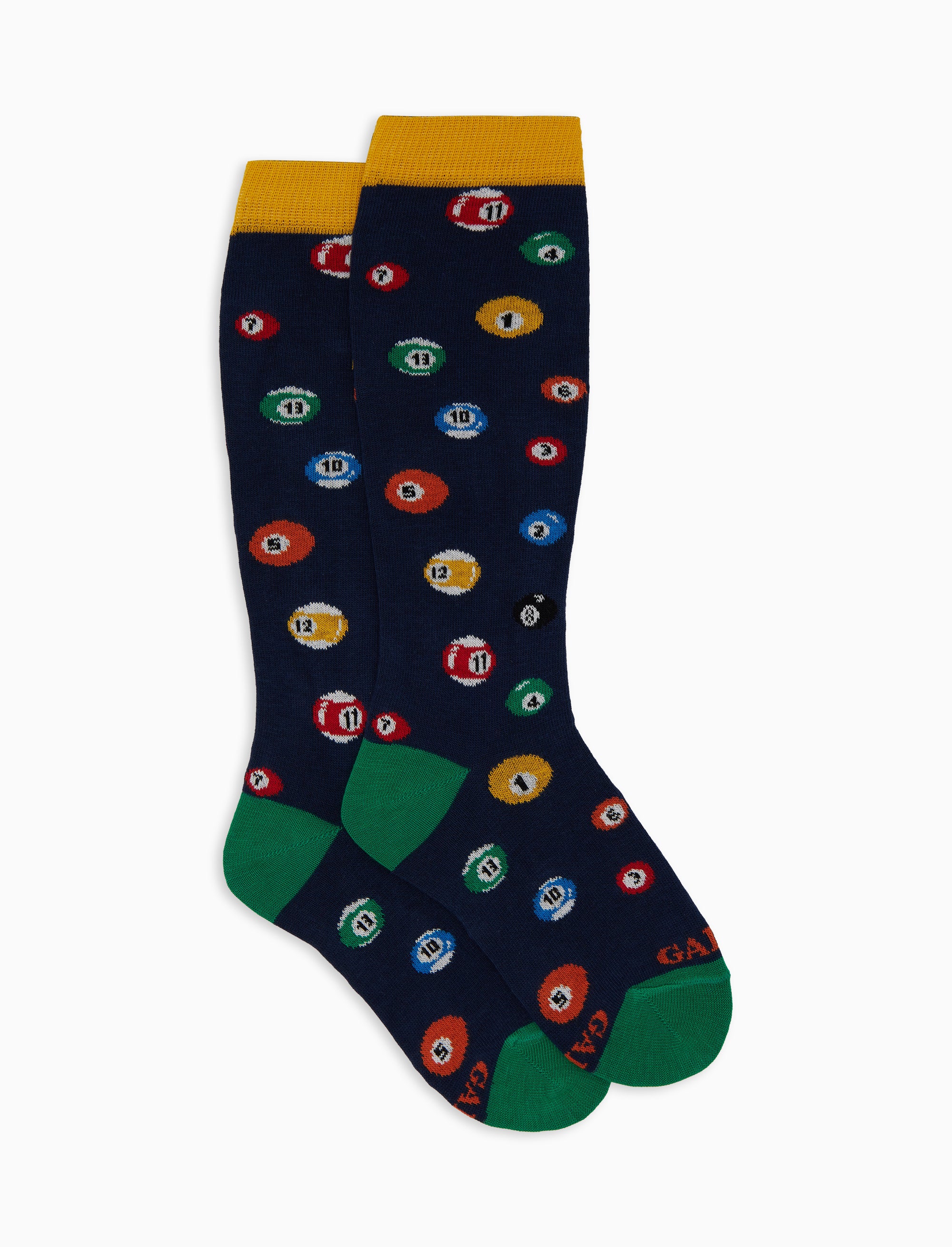 Calze lunghe da bambino con stampa palle da biliardo e punta, tallone e polsino in contrasto colore. La fantasia e i colori donano allegria al look dei più piccoli!