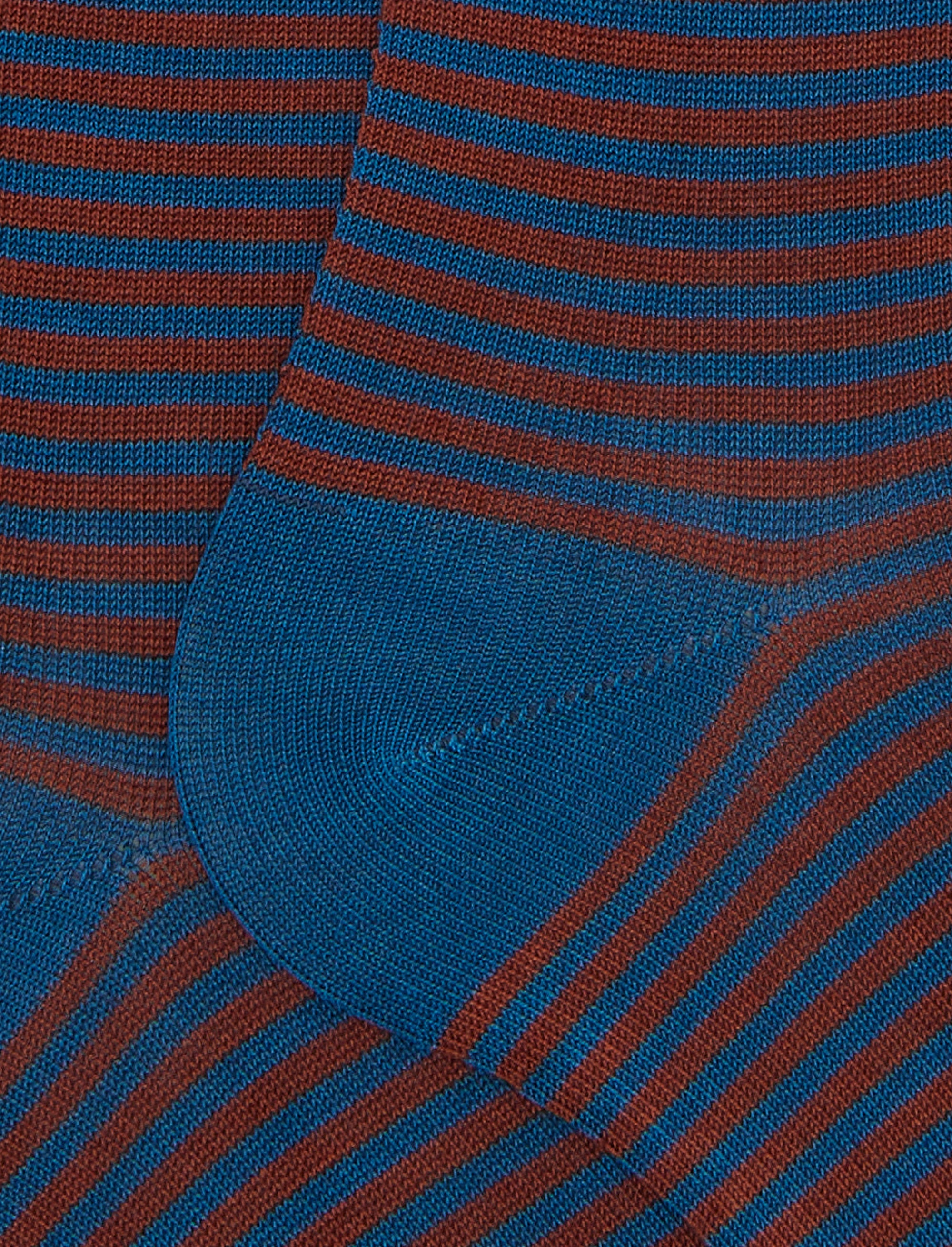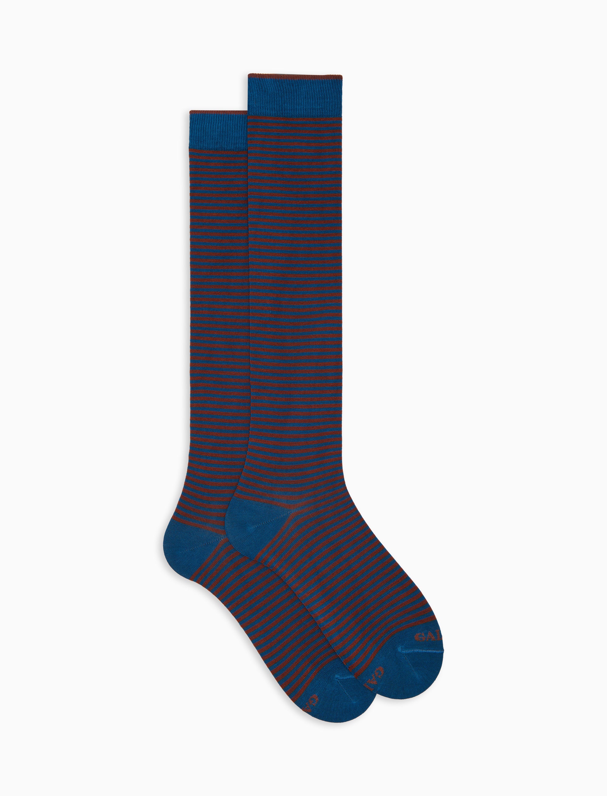 Calze lunghe da donna realizzate in Italia in morbidissimo cotone leggero elasticizzato. L'iconica fantasia a righe windsor, nei toni del blu, rende queste calze immediatamente riconoscibili e perfette da abbinare ad ogni tipo di look. Il brand Gallo è ricamato in punta a contrasto.
