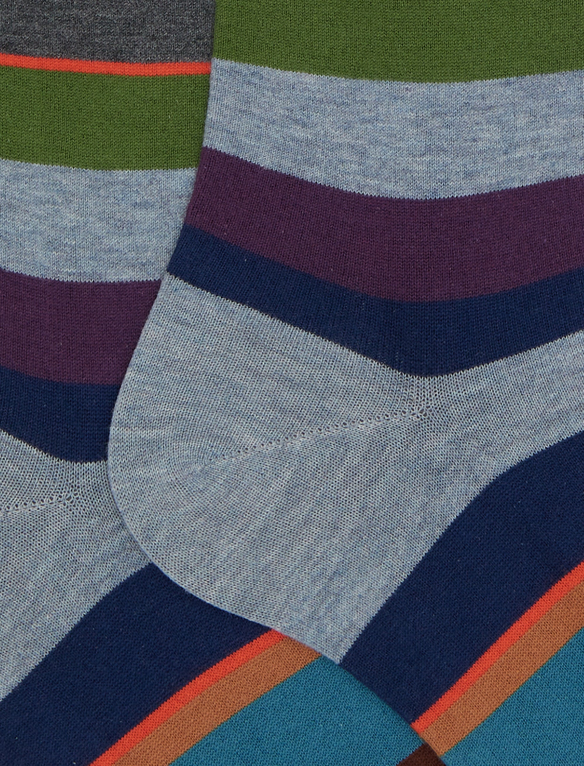 Calze lunghe da uomo in cotone, realizzate in Italia. Molto morbide al tatto, create per una persona dinamica che non rinuncia ad un dettaglio di stile. L'iconica fantasia a righine multicolor nei toni dell'azzurro le rende originali ma riconoscibili. Adatte ad un look formale o stravagante.