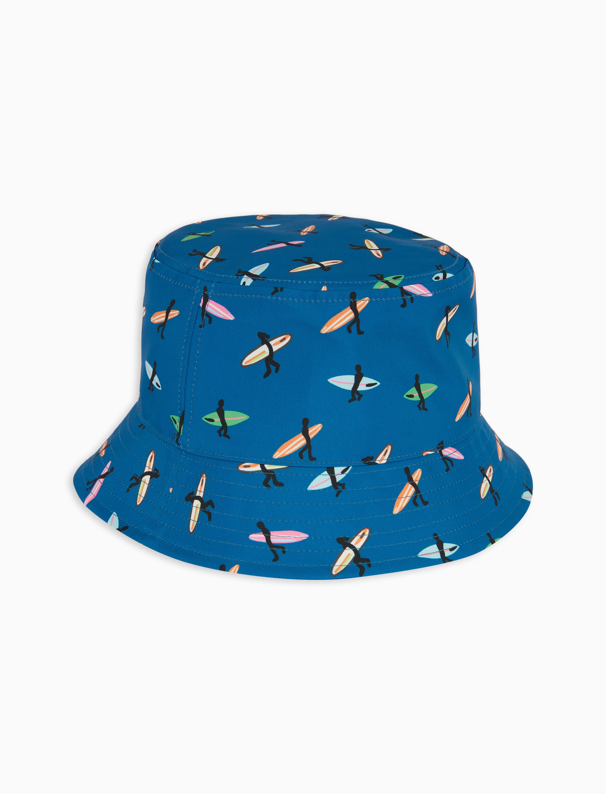 Cappello da pioggia unisex modello pescatore fabbricato in Italia in poliestere. Resistente agli schizzi, realizzato nell'iconica fantasia surfisti a contrasto su fondo blu danubio. Indispensabile nelle giornate di maltempo, può essere indossato anche quando c'è il sole per un tocco di stile contemporaneo.