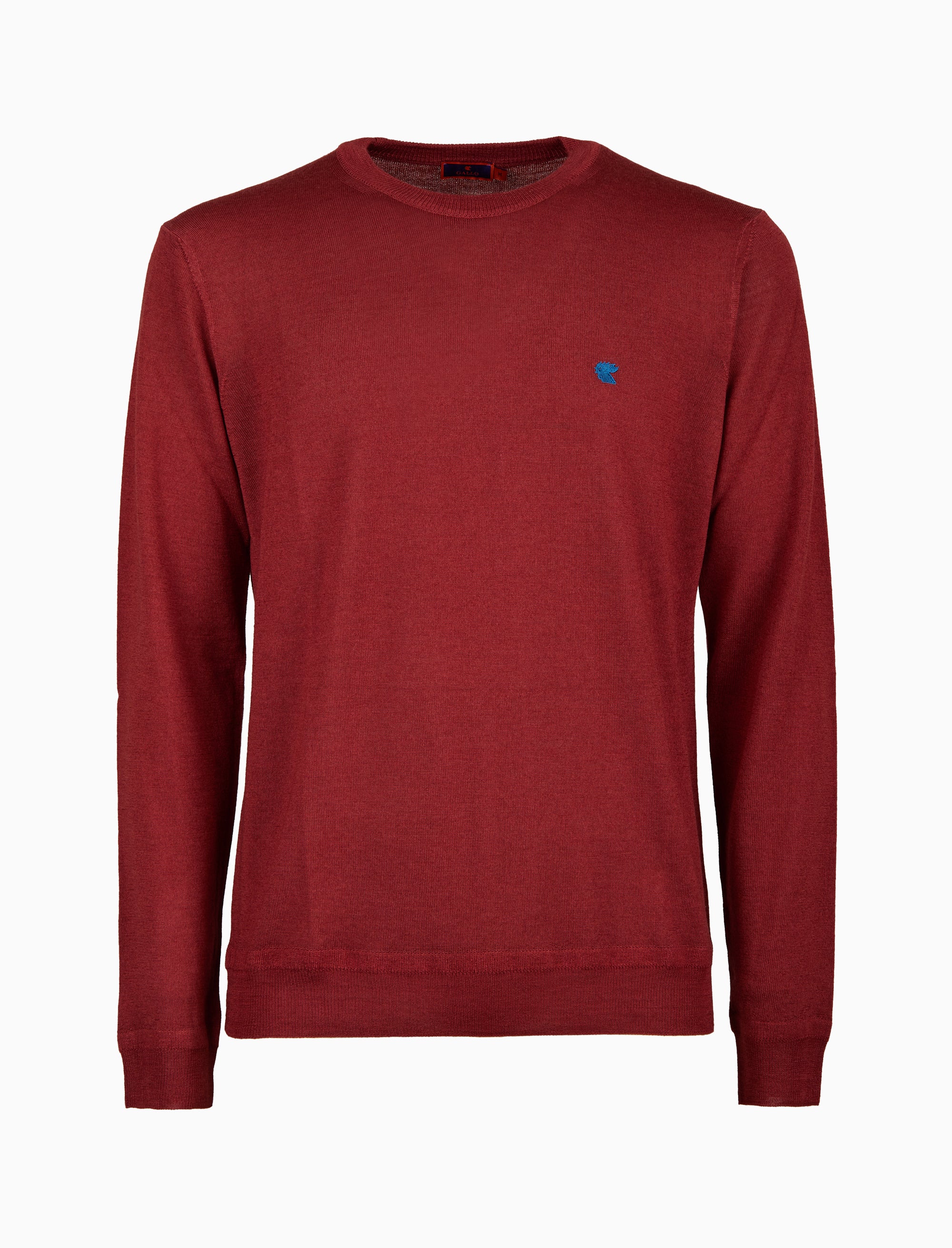Pull girocollo da uomo realizzato in Italia. In lana, su fondo bordò con un piccolo logo sul davanti ricamato a contrasto. Gallo: sinonimo di qualità ed eccellenza dal 1927.