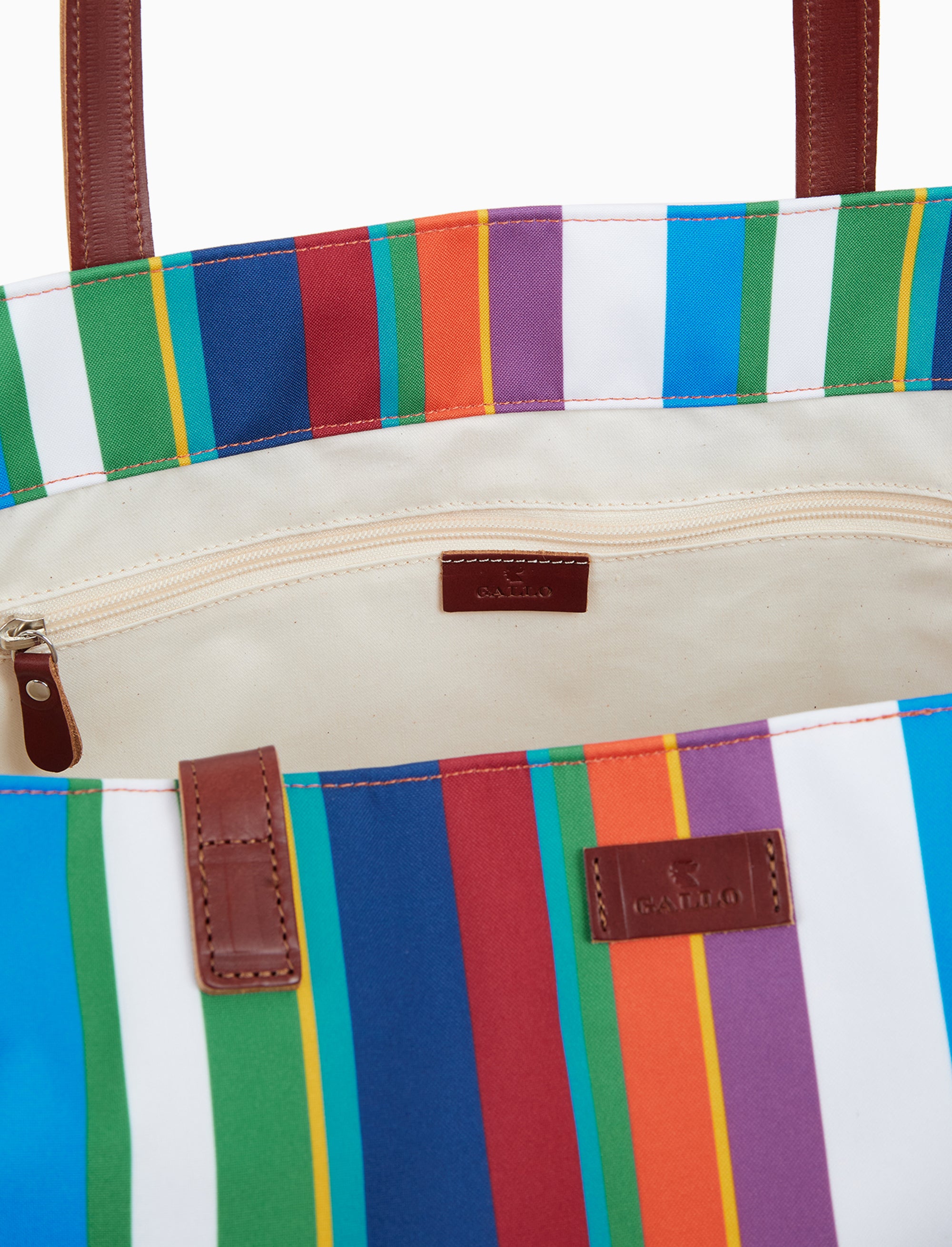 Sacca da mare unisex realizzata in Italia in tessuto tecnico con manici in cuoio. Immediatamente riconoscibile grazie all'iconica fantasia a righe multicolor Gallo: da sempre sinonimo di prodotti di alta qualità. I toni del bianco la rendono perfetta per l'estate e facile da abbinare ad ogni outfit.