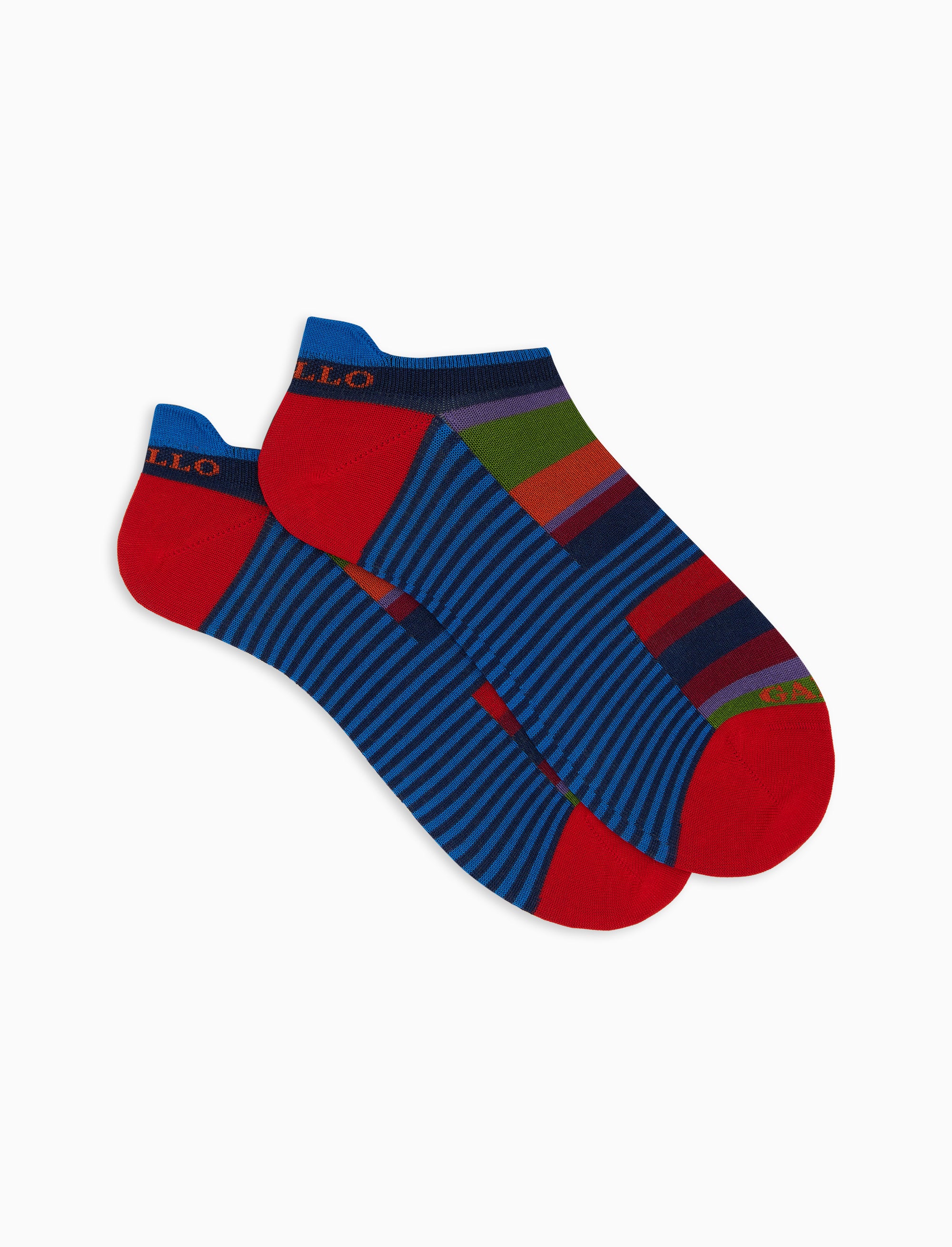 Calze da donna modello sneakers realizzate in Italia in morbido cotone leggero elasticizzato. I colori vivaci delle righe multicolor e windsor, a base blu rendono questo accessorio un vero dettaglio di stile da abbinare ai look più stravaganti.