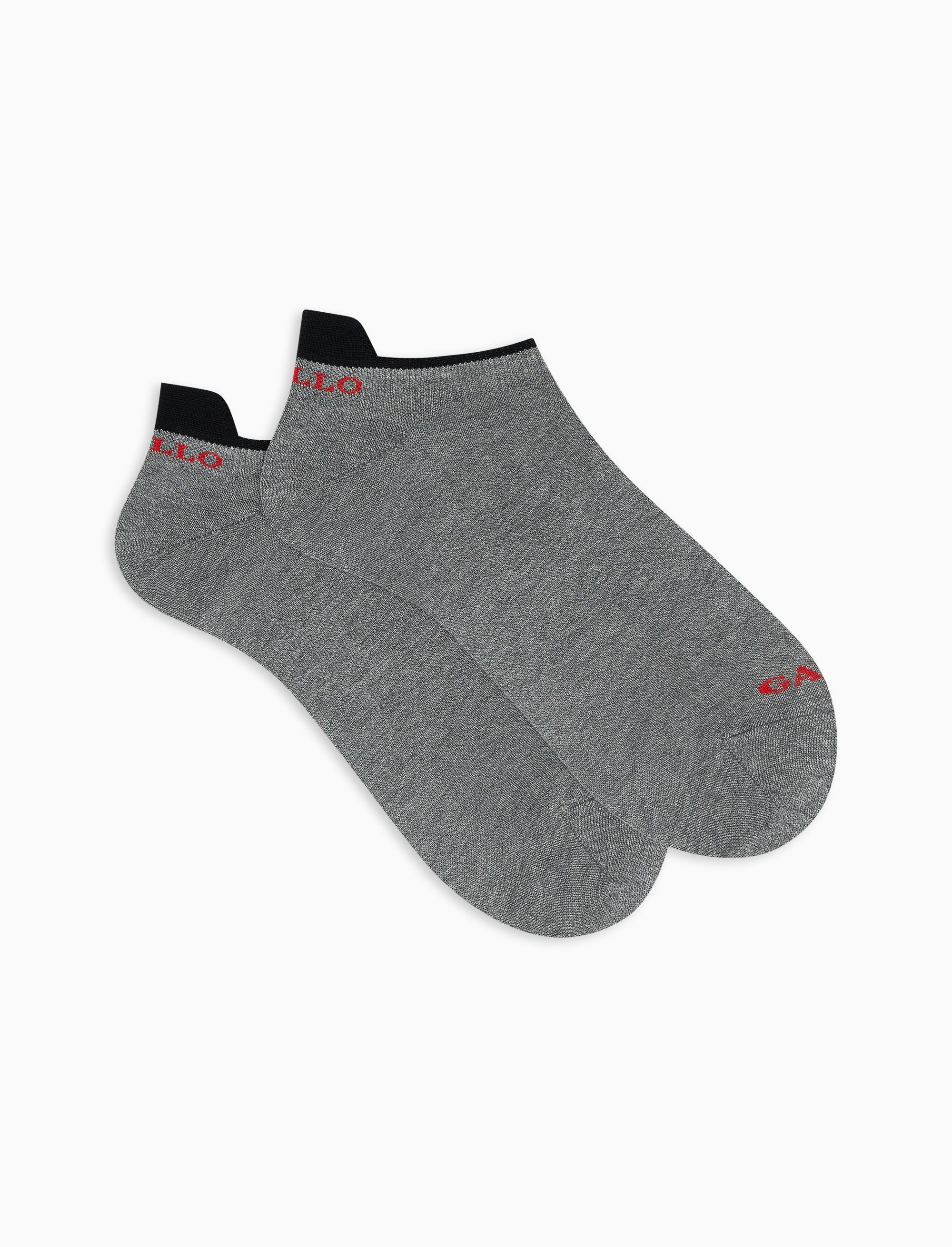 Calze da uomo modello sneakers realizzate in Italia in morbido cotone leggero elasticizzato. La trama tinta unita color grigio le rende perfette per ogni tipo di look, formale o stravagante. La scritta Gallo è in punta a contrasto.